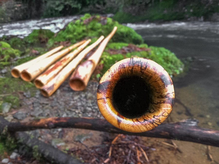 This is another example of the luxury didgeridoo experience. The oak wood is dense offering a deep timbre to the tonal quality, so in this case, a didge that reads between a D and an Eb evokes the sound of a big low didge like a B. We mostly associate didge with that deep rooted sound, the eARTh rumble primitive connection. This stick offers that up with such refined qualities that it's hard to imagine where natures perfection left off and the artists guidance took over. Everything looks, feels, and responds silky smooth. The balance is excellent. The playability is too good to chance messing up with tuning measures to bring it straight on. No problem unless you're playing along with piano. It's rare that a stick holds the same tuning for two players even in a similar situation mostly because of embrouchere. Temperature and altitude affect tuning too so unless a didge has a sliding mouthpiece extension it's almost impossible to say that an instrument is tuned spot on. Let's let bliss be bliss, and that is this. AUM!
