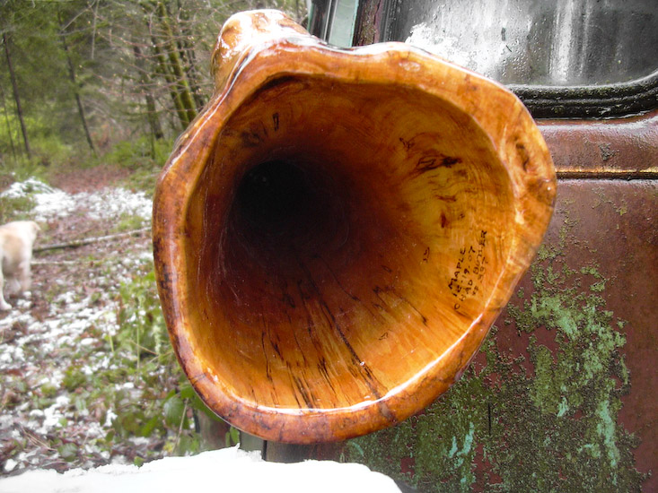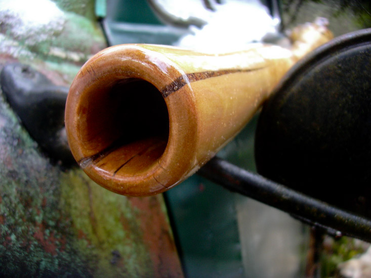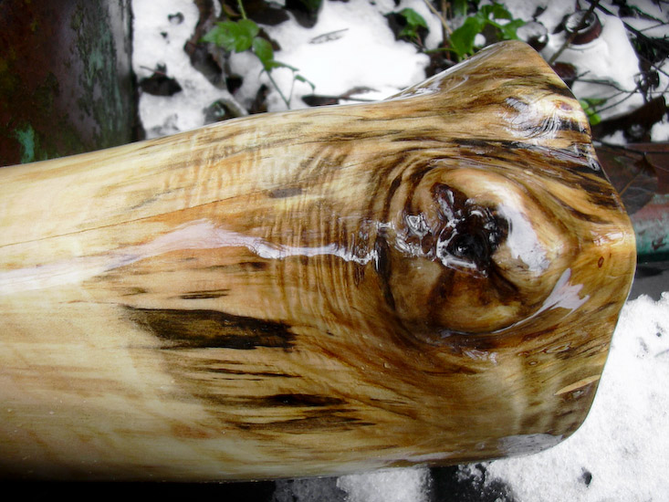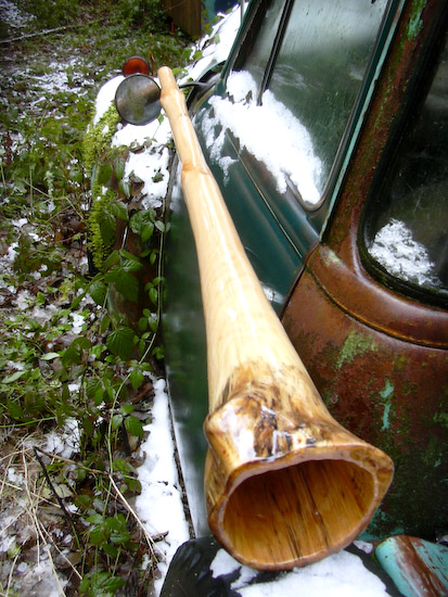 High pitched didges can often seem like suped up cars which can be translated as adolescent but this didge has a very mature sense about it. It's F# tuning offers all the 'I can play faster than you' type potentials which it delivers effortlessly and silky smooth. It's also quite comfortable playing slow and harmonic and doesn't seem out of place doing so even as a high pitch instrument. The overblowns and trumpets are easy and well matched. Everything about this didge just feels so right. The carmel colored maple has nice spalting and fiddleback figuring.