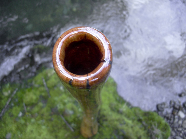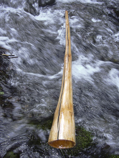 This is the size and shape of didj that really catches my attention. The tighter top end gives super quick response and a higher backpressure that makes rhythmical or percussive playing sooo easy and fun. Vocals project well as with just about every epoxy sealed bore. The overblown is well matched to the fundamental and can be incorporated into rhythms without being abrasive. The first trumpet comes in at under an octave jump which makes it very easy to hit and is also well matched to the volume of the fundamental.