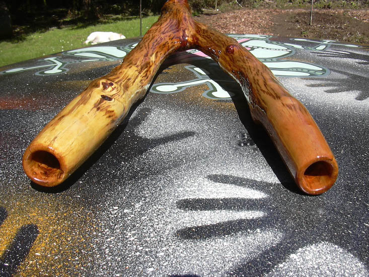 Doubles offer opportunities that regular didges don't. In addition to the ability for two players to play it simultaneously, it can be played with the second mouthpiece covered or uncovered, resulting in a lower or higher pitched fundamental. With the second mouthpiece covered and as a two player instrument it's in the key of Bb. The two topends on this didgeridoo are shaped differently thus as a single player you can choose to play the tighter higher topend in Eb with a matching trumpet, or the more open bored spectacular vocal side which plays in D and has it's first trumpet in Eb. The backpressure is medium, as is common with an open bore or big bore, and so it requires a bit of chasing which might make breathing difficult for newer players during transitions from low and high fundamental notes. But a newer player can enjoy it as a didge that's essentially three in one and grow their skills to the ability of using those flanged notes properly. The sound is clear and well supported. When playing in an upper fundamental the open mouthpiece serves as a loudspeaker just 8 inches from your ear, or as a heart massager.