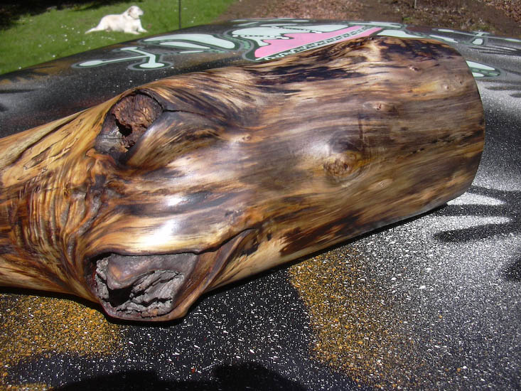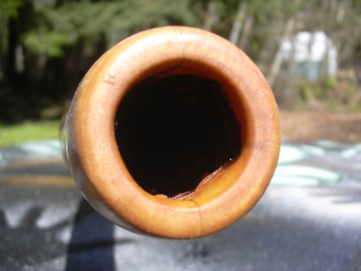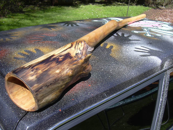 This is the first didj I've made only using oils as a finish. It's out of bigleaf maple and has a pleasantly warmer sound than an epoxied bore without giving up any volume or sense of power. The mouthpiece is very comfortable and easily approachable with a narrow outside diameter. The sound is clean without being brite. It has a deep timbre and excellent balance.The trumpets can be pushed hard for dramatic effect or it can play the Ed Drury style 'tups' incredibly well. Same goes for the overblowns, either soft and subtle or hard and earth shattering. My biggest concern in contemplating shifting from epoxies to oils was whether my local woods would sound as good with an oiled bore and I'm very pleased to find that this is one of the best sounding didges I've ever made. I'm still concerned that the finish won't be as hard and that it'll be more susceptible to scratches and dents but you'll just have to love it like a skateboard and ride it hard because it's built to shred. I used only pure oils, tung, linseed, and citrus that I obtained from twisp enviromental. If you're a woodcrafter I reccomend you look them up.