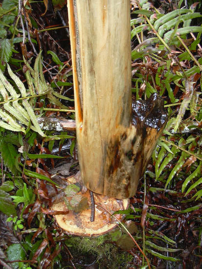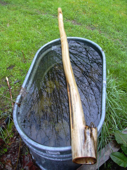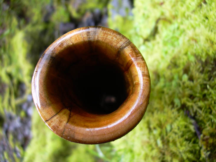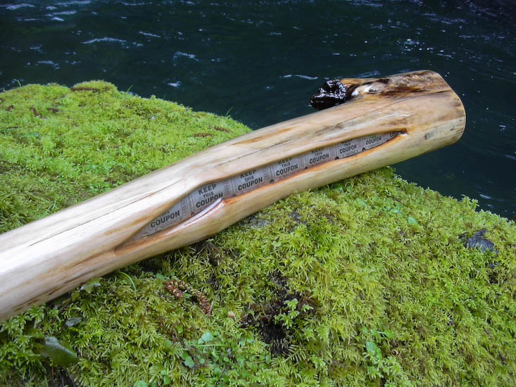 This tree broke in a winter storm a few years back and even though it didn't have a very large diameter I knew it HAD to become a didjeridu. In the bottom picture there it's sitting on it's own stump which is adjacent to the nearly famous Shiva Shack lounge of the first nine years of the In-Didj-In-Us gathering. When I carved into it I was disappointed by a long strip of punky wood that would result in an opening sixteen inches long and less than an inch wide. For every problem there are numerous soloutions and in keeping with the mirth and creative energy of this trees location I turned it into an art project filling the gap with a string of tickets that read "KEEP THIS COUPON", and then filled over them with a clear window. The wording fits, not only aesticly but also in the fact that it's very meditative and can be a conduit for intense power. Coupons, or tickets, allow for access or opportunities, this one is about the eternal inner journey. My first impulse is to play it slow, feeling the harmonics and having it respond to subtle changes in pressure and volume, then I'll hit it with a few diaphram slaps bringing out well matched overblowns with very little effort which tricks me into thinking that it's a power stick and I start getting distracted with the expectation that power in this world is fast and loud, but then it reminds me that real power is meditative and directable. The vocals project well as with almost every epoxy coated bore yet the overall feel is not overly bright or crisp, however, I wouldn't call it a dirty sound either. The harmonics and pressure are consistant with longer cylindrical bores and even though C# doesn't seem that low it offers opportunities to work on those low keyed techniques, which I'm assuming will become the new rage in the didge scene exemplified this summer at a didge festival near you.