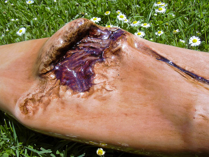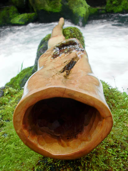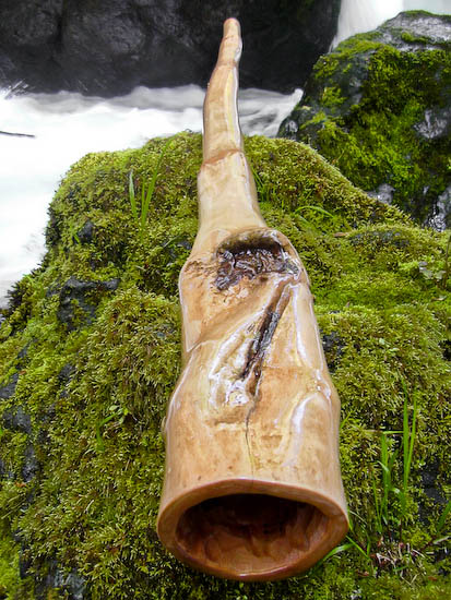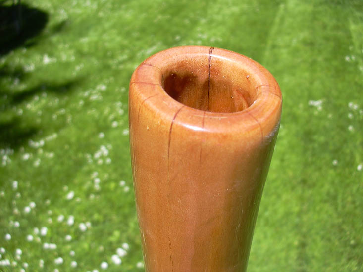 I'm pretty sure this wood is some type of fruit because of it's density, but I wasn't able to tell from the tiny amount of bark on it when I picked it up, at any rate, that yields a very solid feel and sound. It plays more like a D or E than an F. The exterior is epoxied but the bore is treated with pure oils of tung, linseed, and citrus which gives it a tonal richness with a better balance to it's harmonics. The backpressure is ideal and it plays equally well either full tilt with tons of pressure or barely at a whisper. Vocals are great. Trumpets are slightly bright to the drone and the overblown is well matched. Very mature and well behaved. The photos speak of it's appearance. Enjoy!