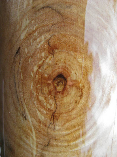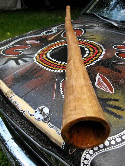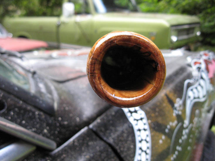 I did everything right on this one. The bore just tapers rather than flares or bells. The walls are very thin up top for responsive play, thickening up through the middle and downright thick at the distal end to contain the power and deliver concert quality sound. Very well behaved, well balanced didge. Excellent vocals. Trumpets are a bit bright to the drone. Overblowns are well matched. I wrote maple on the inside but I suspect it might be alder, either way, it sounds sweet and looks gorgeous. Below is a video of Jake Duncan mostly playing the trumpeted notes, though if you listen close he does hit the fundamental from time to time. Enjoy.