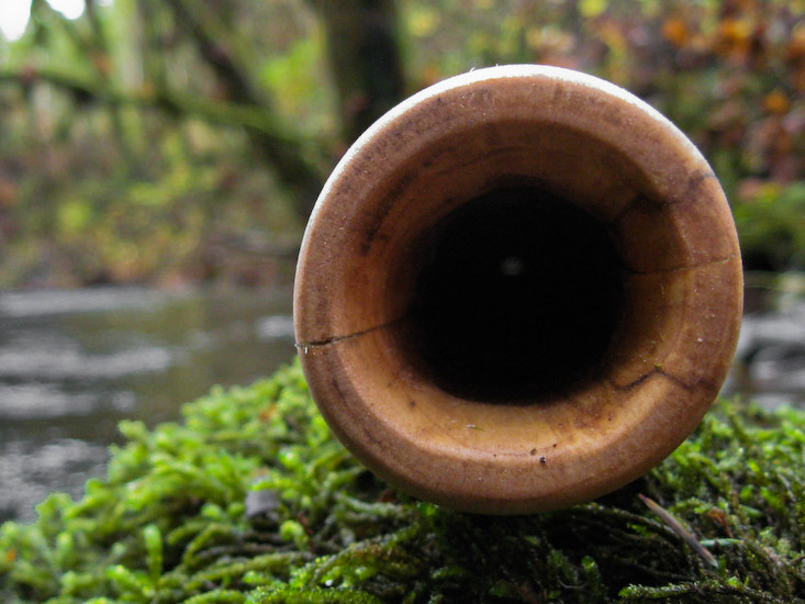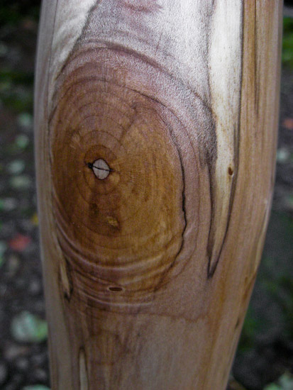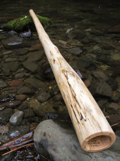 I like to offer a well rounded selection. I already dished out very high, so this is to bring in the bottom end. This low B is finished in oils inside and out which gives it a more organic (less harsh) sound than the epoxied bores offer. That combined with the mellow shaping, just a slight taper throughout the entire length, gives it a relaxed, well balanced, well behaved characteristic. It doesn't go just go off the handle, pulling a 'double maveric' offering up sounds and outbursts outta nowhere, it waits until it's told, then behaves exactly as instructed. It will play fast and crazy with easy trumpets if that's your deal, or it'll play slow and medatative with easily manipulated harmonics and excellent vocal projection, if that's more your bag. I like both and this is an excellent didge for someone who just wants to enjoy playing or who wants a good low didge for recording. Not really loud enough for a busking didge, but that makes it friendlier in most environments. I love the finish with pure oils of Tung, Linseed, and Citrus, a lower gloss and more tactile connection to the woodiness of the stick.