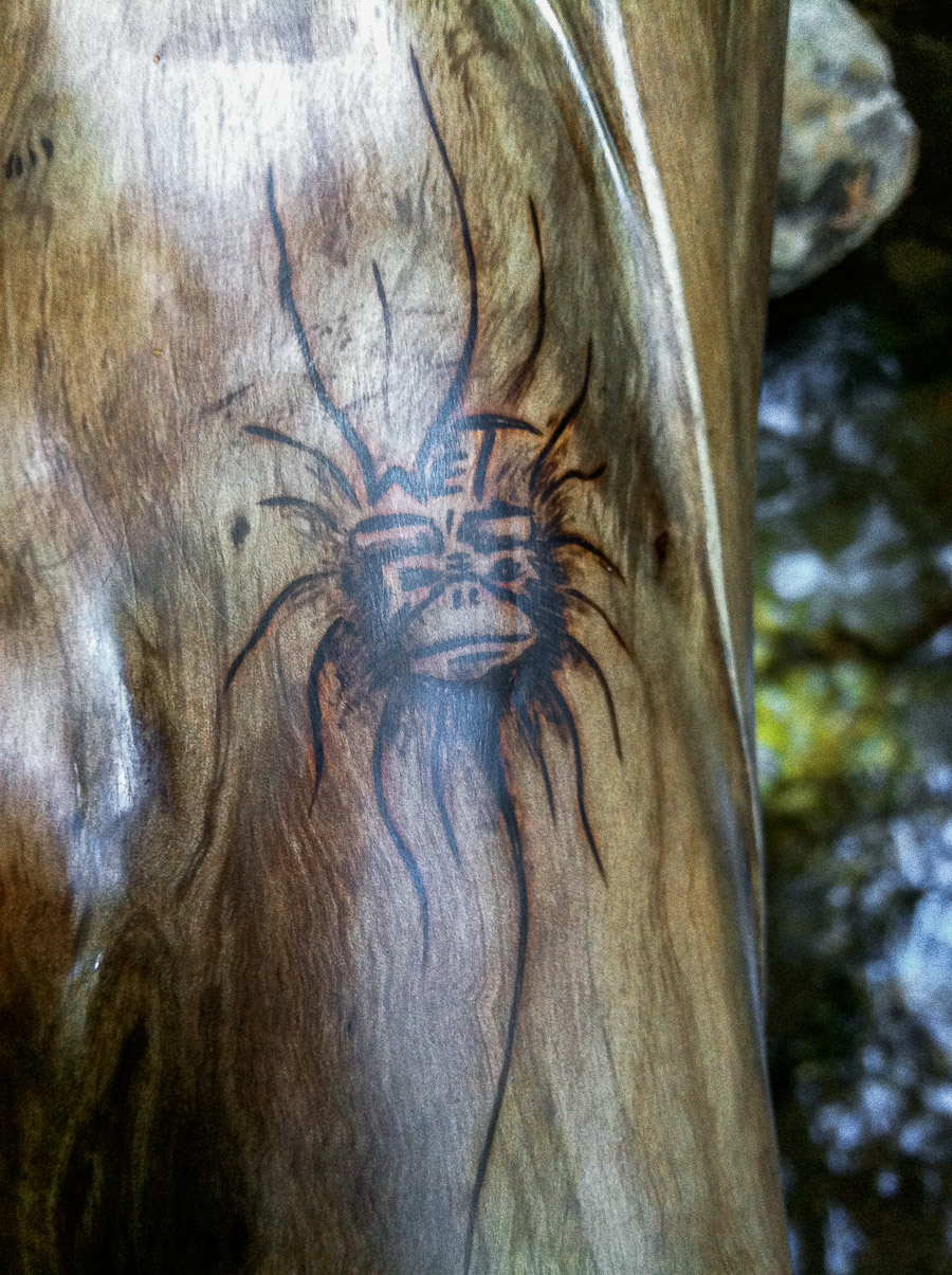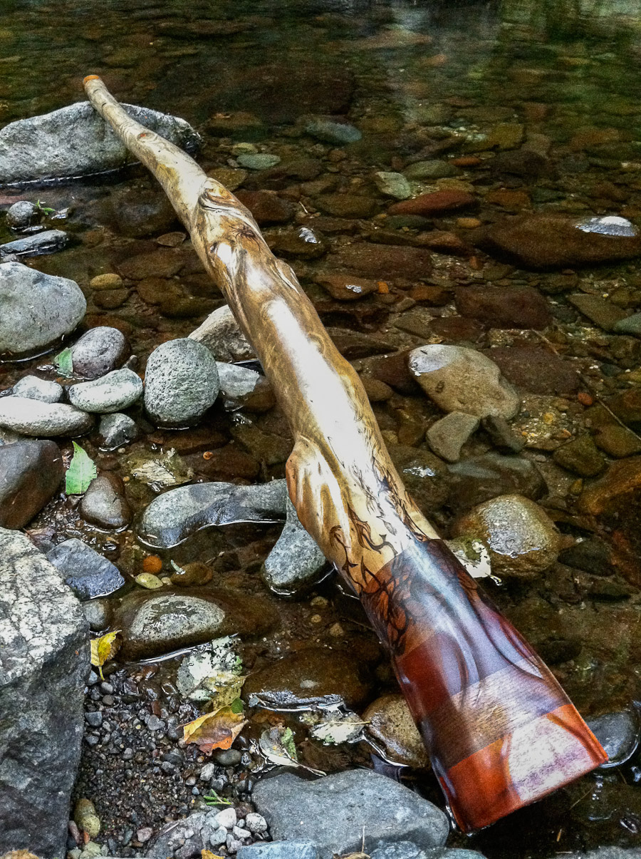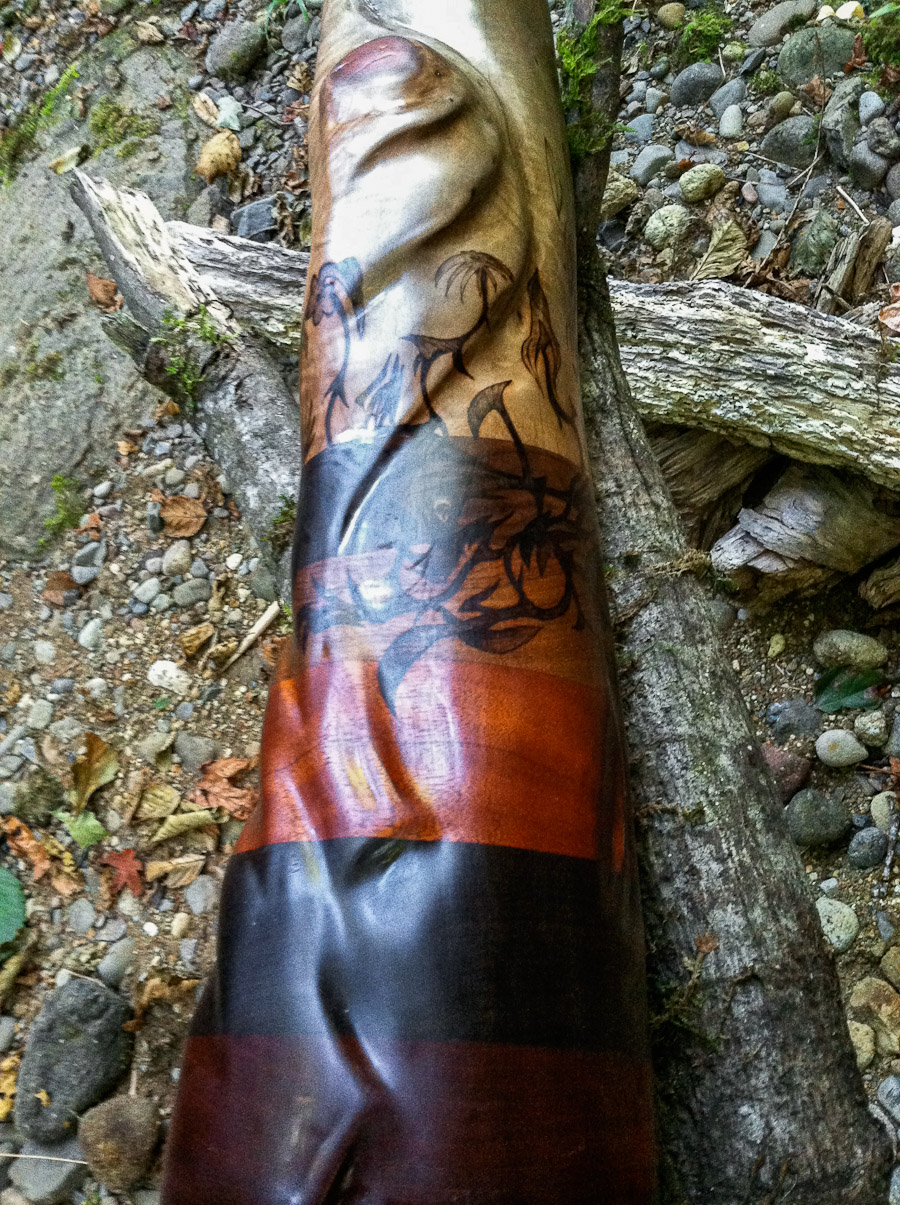 An amazingly beautiful instrument by multi-talented artist William Thoren. Check out his photography at www.williamthoren.com and his didgeridoos at www.wetdidgeridoo.com Will pioneered a drop octave technique which expanded to a multi-drone technique. His passion for playing, crafting, and deep thought has resulted in didges that are clear evidence of his comprehensive knowledge and incredible abilities. He's such a sweetie that he donated this fine piece as a donation to fund In-Didj-In-Us.