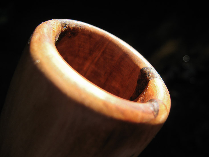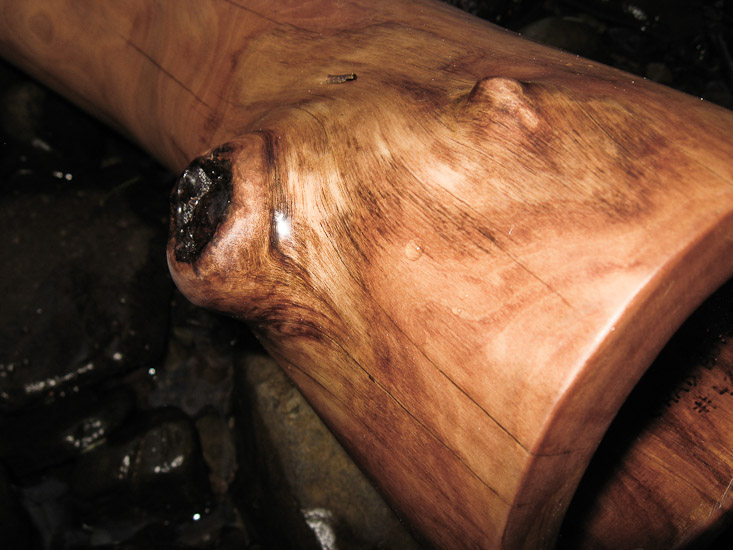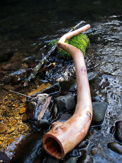 This stick is crazy beautiful! I remember finding the downed log on a hillside in Mendocino, picking it up and knocking on it to hear a good ting rather than just a thud and imagining the promise held within. It has fantastic jaw drops, you can pressure up to the trumpets, similar to a tight top stick but this is slightly open and has nice harmonic control as well. Much better behaved for a twisted stick than I would have imagined. Although the length is 60 inches the height is only 55 because of the shape, and so it can pack up and ship off to Europe for cheap prices rather than the outrageous shipping costs of anything over 60 inches.