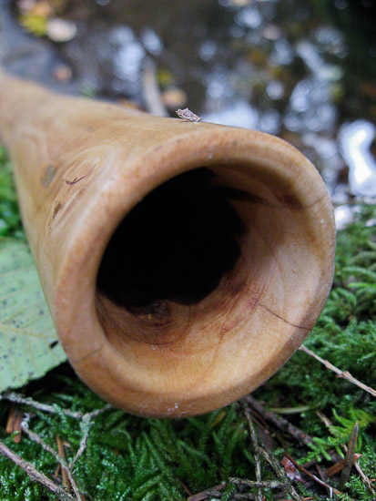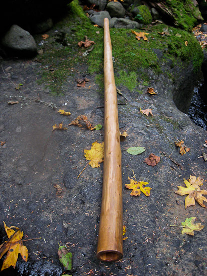 Awesome vocal harmonics combined with a very low drone makes this so fascinating to explore with. Vey easy to play for a low pitched didge. Straight, narrow and light enough to carry on foot or ride along inside even small cars. Carefully tuned wall thicknesses throughout the length create a responsiveness in the top-ends thin walls and in the bottom end the thicker walls provide a deeper timbre and better delivery of the power. The bell is an ideal size for microphone and recording projects, it's definitely a concert quality instrument. The tone is a little warm which is more organic and appealing than the bright tones of more open bores. The trumpets are easy to hit. The overblowns are also warm and can easily be utilized in rhythms without being abrasive. The mouthpiece is bare wood oiled with pure tung, linseed and citrus for good lip traction. The rest of the instrument is double resin coated for moisture protection and durability, then given a satin finish for a natural beauty and pleasing tactile experience.