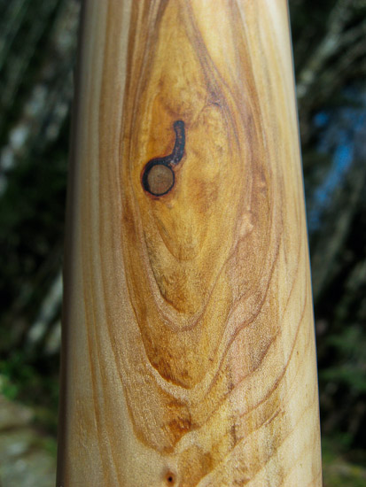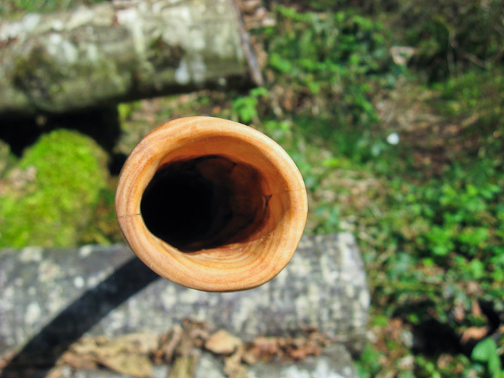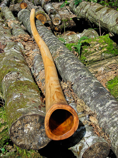 Of the three C# didges in this update, this is the one that I'd take off in the woods to sit somewhere and enjoy sonic meditation, be it soft prayer or ecstatic kirtan. It has the responsive qualities of a very nice agave combined with a deep timber like a very long and solid stick. The trumpets are very easy, dependable, and well matched to the volume of the drone. The overblowns come easy, making for a nice kick drum on percussive pieces and can be pushed hard for abrasive fits of fury.