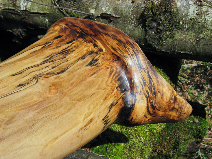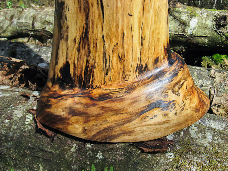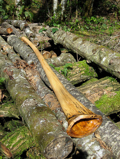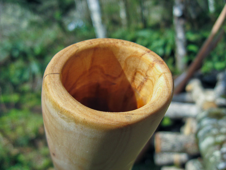 Don't be fooled by the bell measurements to think that this didge has over the top bass response that would destroy the mid and high range frequencies. This gorgeous piece is very unique and really surprises me. The flare at the base it actually the collar of this thick old maple branch. Most of the pieces I craft are from the trunk. Branches grow in girth at a much slower rate and are therefore more dense with tighter grain, which tends to provide a deeper timbre and more supported sound. The bore is an odd oval like an oversized axe handle shape. I was skeptical of the oddness of the piece to work with but it had such a promise of beauty that I had to see it into reality. It is very lively, loud, and well balanced. A very high quality both sonicly and aestheticly.