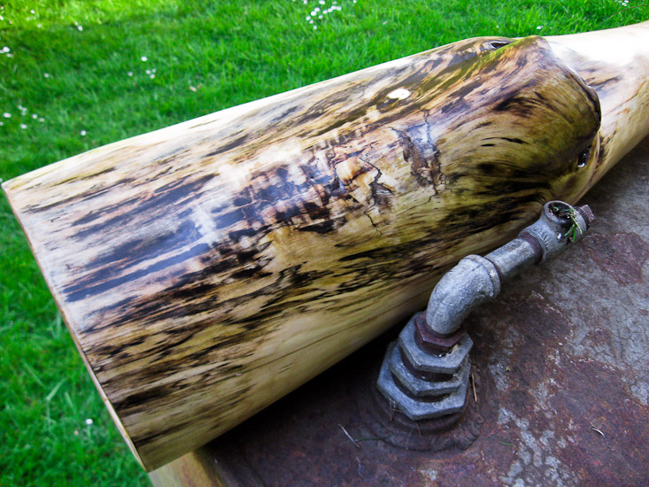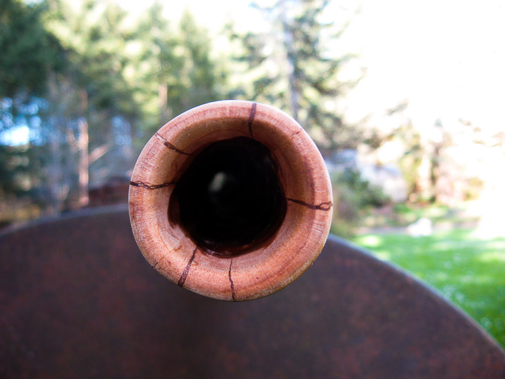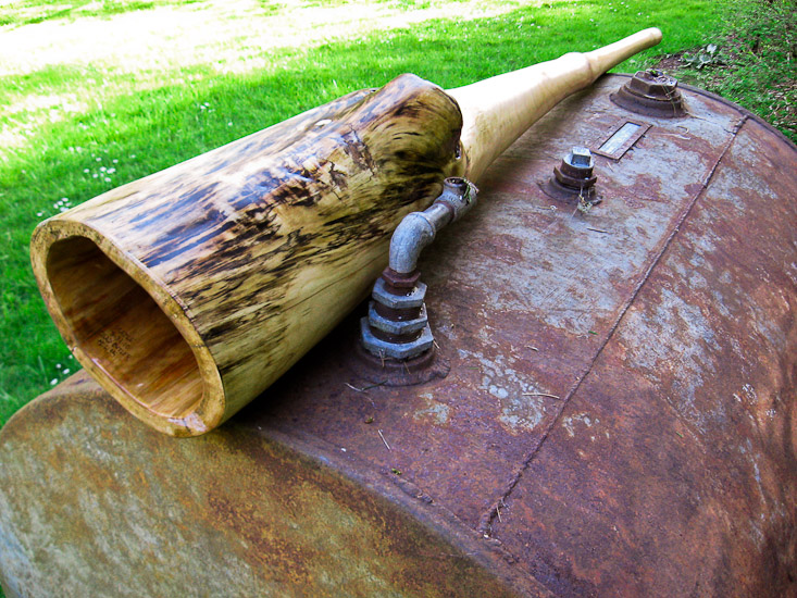 Read what I said about the C in this update and apply it to this F. Also close intervals and dramatic jaw drop. More of a blunt delivery than the C but still a very comfortable backpressure to work with. I honestly built it thinking that was going to cut off the bottom 10 inches after I'd play it for a week or so, as an experiment in hearing and feeling the difference in bell length. I decided I like it too much the way it is and so here it is, in all it's splendid rediculousness. Big bells are kinda like monster trucks, they pack enough machismo to make up for a small penis. You don't even have to have a penis (or like 'em) to appreciate the power and volume. I'm still willing to cut the bell shorter at no extra charge. That will result in the trumpet rising up to match the fundamental. I actually like it for the effect of the long bell on vocalized harmonics. Heavy and solid at about 11 pounds. Any other instrument on my site right now would be a better choice for anyone that can only own one didge, but this is weird, and cool, and sometimes ya just gotta...
