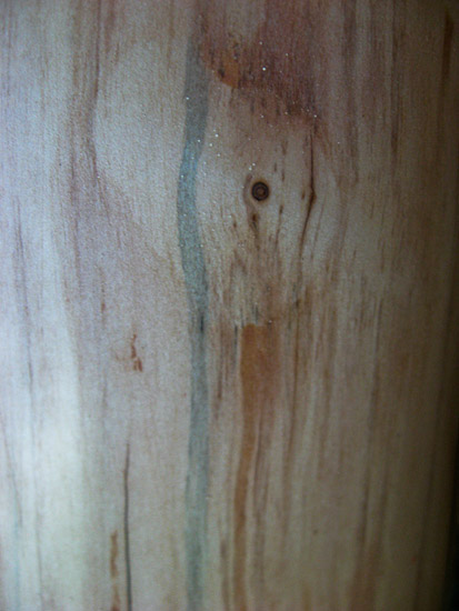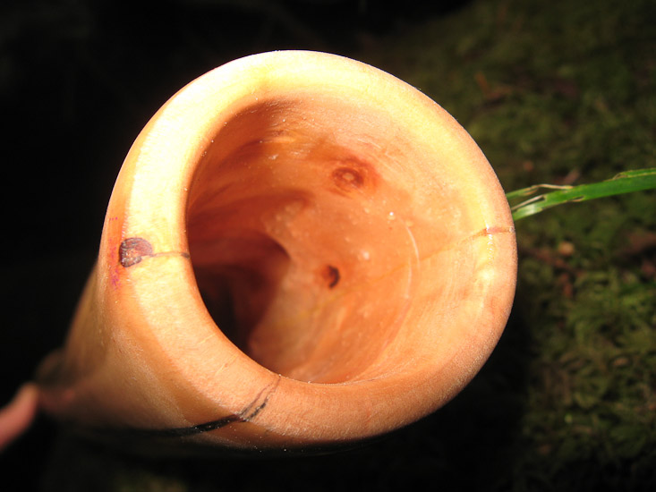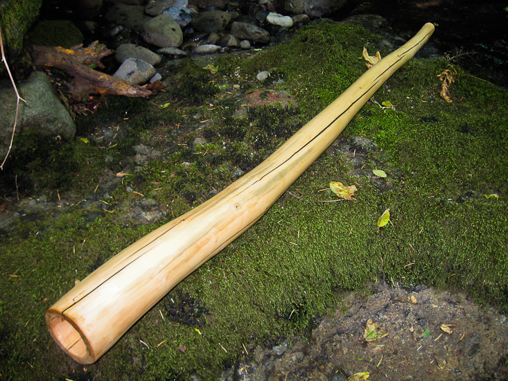 This Hemlock is very dense and this didge has a solid direct delivery. The sound is very professional, the overblowns are nicely matched, and the trumpets are easy and dependable. It has a comfortable oiled mouthpiece. The checks are filled with a strongly contrasting black, and the spalting is shades of grey.