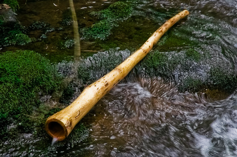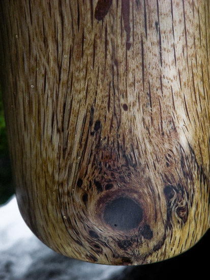 The action is go. Really easy to wake up from a slumber with just the slightest touch of wind, and plays smoothly through it's transitions up to super roar. Well balanced didge. The walls are crafted at only 1/4 inch thick up in the top section to give a highly responsive aspect to the section interacting with the players breath, and then the walls thicken up to deliver a well supported note with a deep timbre. Another piece of Oak from the yard of Jason Strazzabosco, Central Coast of California. Not afraid of water and already knows how to swim.