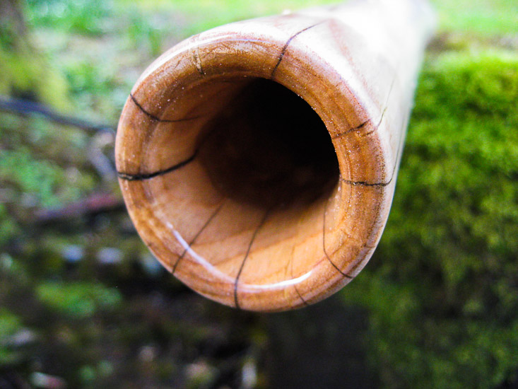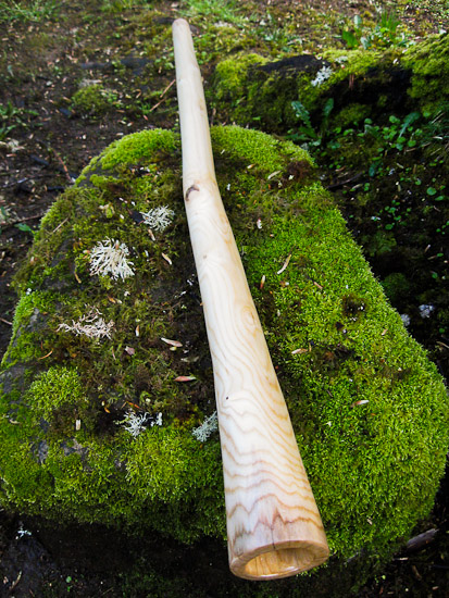 I tried to give this a more open top end and a slight taper throughout to make a shorter didge with decent backpressure, an easy middle-ish key, with good harmonics and vocals. I nailed it. I'm really impressed with what a snappy E it is, and with how solidly supported it feels. It'll take any amount of pressure you throw it and keep it all in control. The overblown is well matched and the trumpets a bit bright. This is a good friend size, can go anywhere with you all the time, always sound and look great, and be durable enough for a long term relationship.