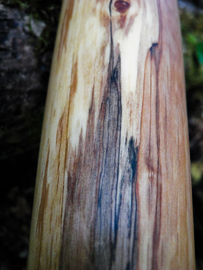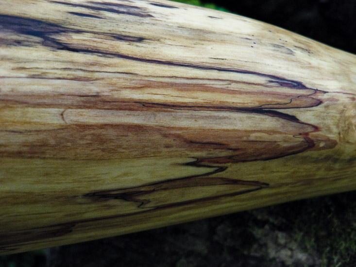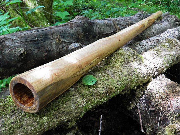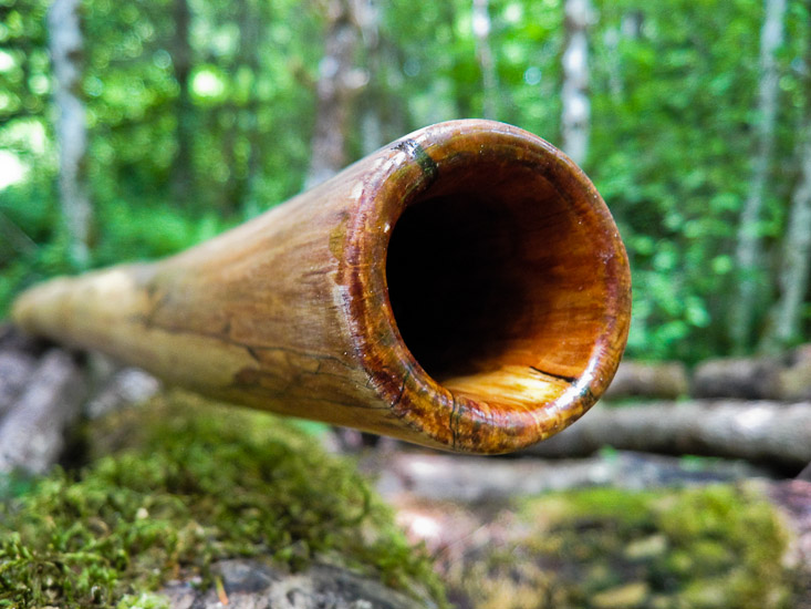 You don't really expect super high end products to be overly flashy, but when you look close the quality is obvious. This spalted alder is gorgeous and the shape is one long gradual conical taper. No big bell to throw off the balance or or screaming 'look at me' antics employed here, just an honest sweet ass player that's light enough to hike with all day and good enough for serious recording studio sessions. I made it with an open top end for excellent vocals and harmonic response. The trumpets just happened to land at very nice intervals too. Definitly soon to become someones BFF.