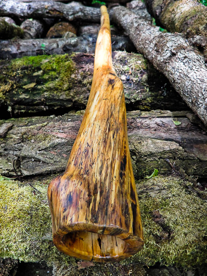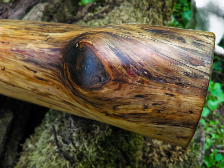 This tighter neck that opens into a conical taper is often what I'll label as my 'Instant Rockstar Kit'. This didge fits that label. The top end being as compressed as it is causes an exageration of any tiny tidbit of information you give it. It's kind of like playing a video game in which your race cars' accelerator is way too twitchy and delivers too much power...until you learn to drive it like you stole it, then all of a sudden you're a whole new character with super powers, in this case, a freakin' rock star, and obviosly your racecar is a didgeridoo (duh!) , one that magicly makes you way better than you actually are.