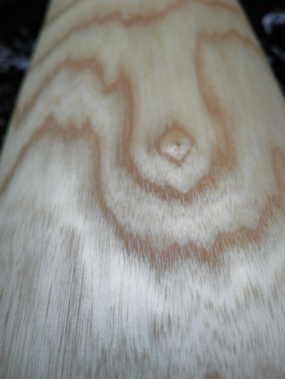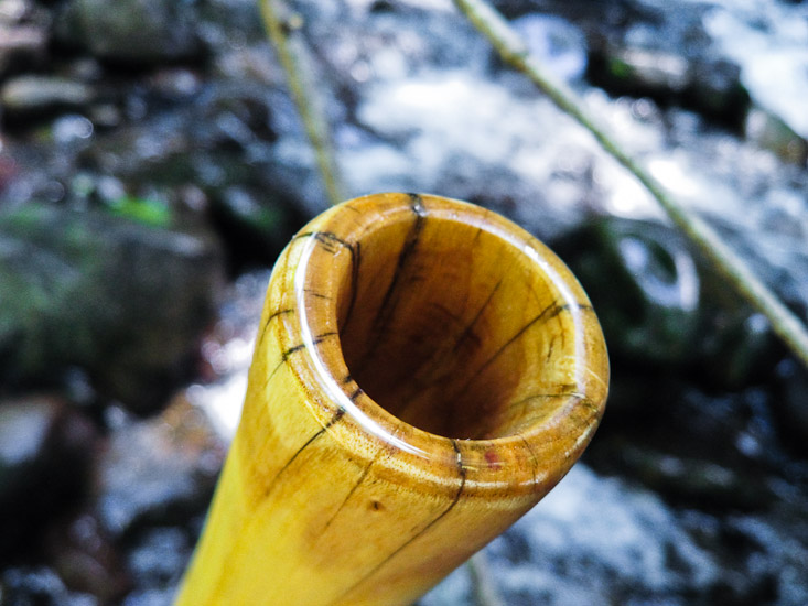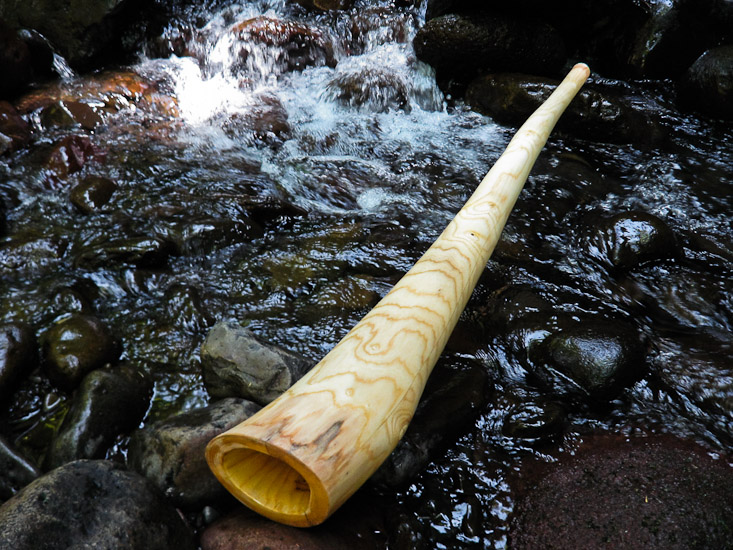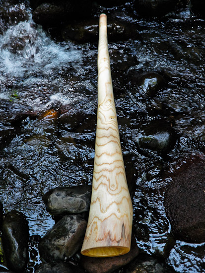 This one has had me really excited. The shape is definitly on the verge of being too dramatic for good controlable sound, and although it does have swervy characteristics it also has a pretty dynamic range. My son complains that the starting point on the drone is something like 50% (with most didges starting around 20%) but I don't mind because the top end of the range is like 250% !!!! The overblown on this thing is unreal when pushed hard, and incredibly encouraging when used in rhythms. It's fast, explosive, loud, and dynamic enough to be controlable. Same wall thickness gradation as most of my sticks, so the solid bottom end gives it plenty of support but the thin top end gives a good responsive feel.