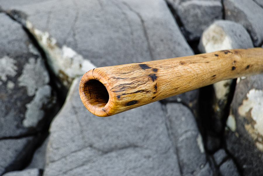 Intended for appreciation by those with fine taste. The dense oak and restrained bore shape delivers a balanced and articulate palate for creation. The trumpets slide up and down with precision and ease. The vocals are somehow crazily amplified. I'd expect compression and grittiness, but I'm wrong. The overblown is well matched to the drone and has a great presence for just pushing on, raking back and forth. A pretty special match up of attributes. Check out Nico in this youtube video doing a one-take. No prep, just picked up and played... awesome.