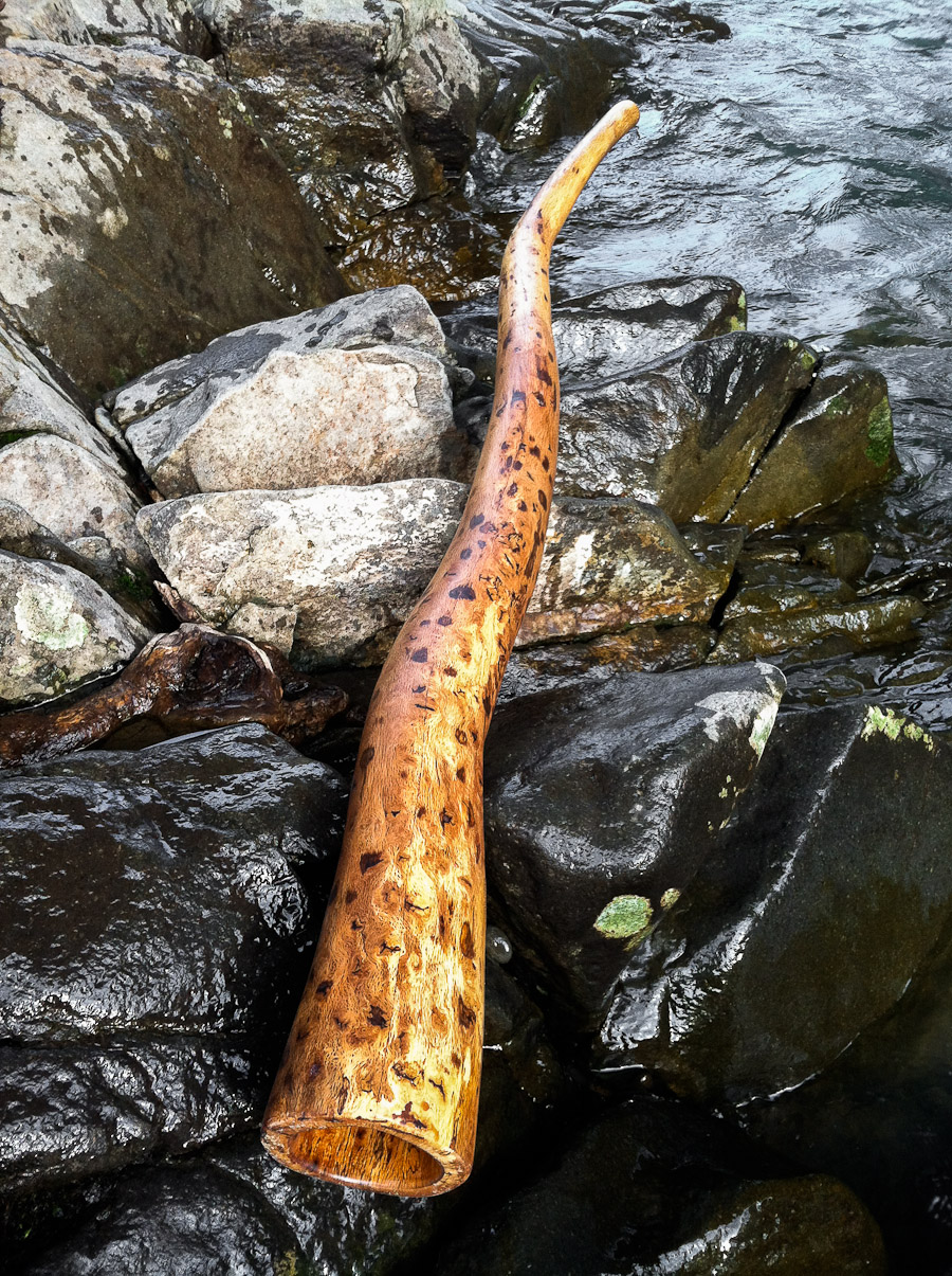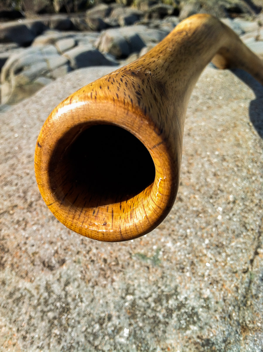 This is an amazingly beautiful piece of Oak from my friends place in California. Check out that detail shot with how twisty that grain is. The bore shaping is just a very gentle taper giving excellent balance leading to a concert quality/ recording quality sound. It's trumpets are easy and a nice succession. They're well matched to the fundamental as is the overblown. The vocals pop right out as with almost all my sticks because of the reflective coated interior.