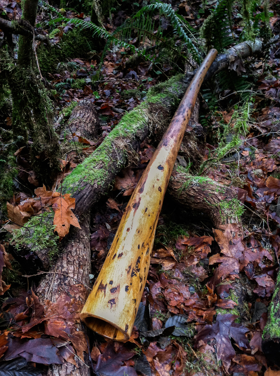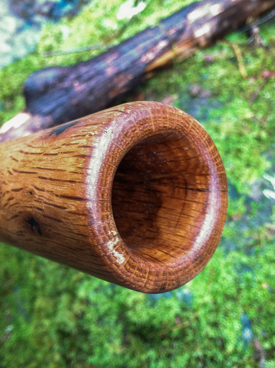 I've worked with this dense oak to create an instrument with top end walls thin enough for responsive play and thicker walls throughout the lower two thirds to support and transmit every ounce of power you put into it. The boreshape is formed to create a nicely balanced playability. Matching trumpet. Well matched overblown. Projects vocals well like all my sticks. Nice deep timbre. Concert/Recording quality instrument. Gorgeous Oak with tons of character and a comfortable sanded mouthpiece. No beeswax ever needed on my instruments.