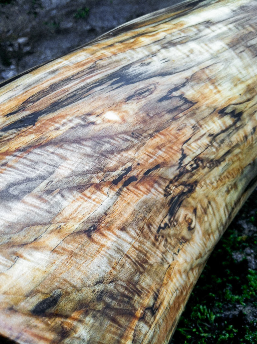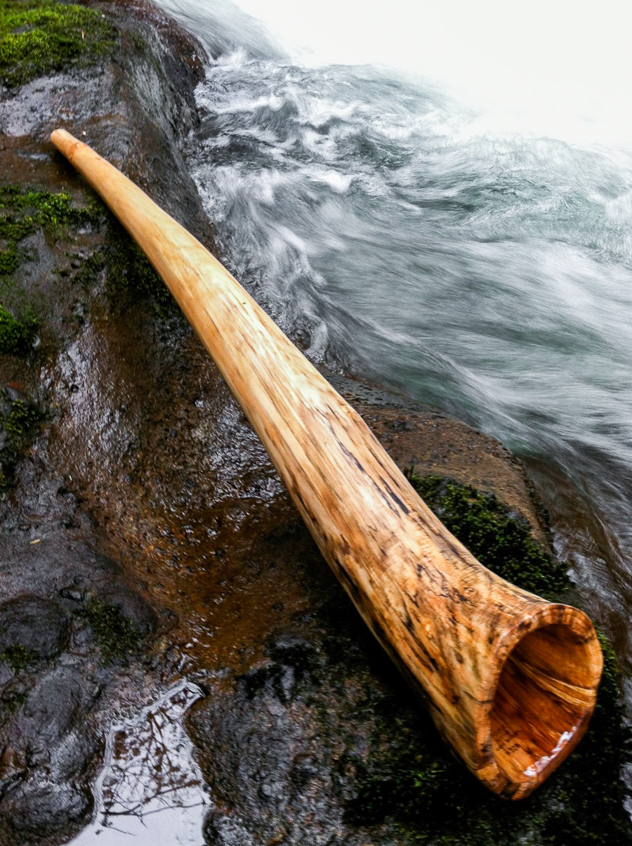 A perfect exhibit for the argument that function doesn't disqualify art and that art doesn't impede on function. This didge has a very pleasant saxaphone style curve to it. I made a flat edge along the bottom of the bell to make it sit straight so it play's it's best, naturally. The bell has amazing fiddleback and spalting. The exterior has been de-glossed. Glossy finishes seem to send the subliminal message that you shouldn't touch it for fear of leaving fingerprints. The matte finish invokes a more pleasant tactile connection between the object (this awesome didge) and the objectifier (maybe you). I do this with (almost) all my sticks now, unless features make it too difficult to de-gloss.