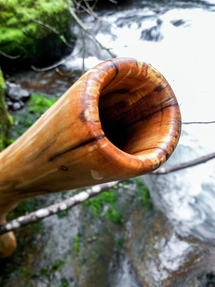 The bore is shaped for big booming sound and the wall thicknesses have been carefully paired with the wood type density to optimize the tone of this instrument. That's the kind of beneficial crafting knowledge that comes from having crafted over 500 hardwood didgeridoos and being fairly relentless in manifesting opportunities for artistic cooperation with other didge crafters and folks of all influences within this didge community. Properly loud for busking or public performance, yet capable of playing soft enough to not interrupt your wife's sleep too much.
