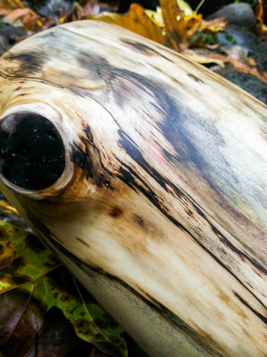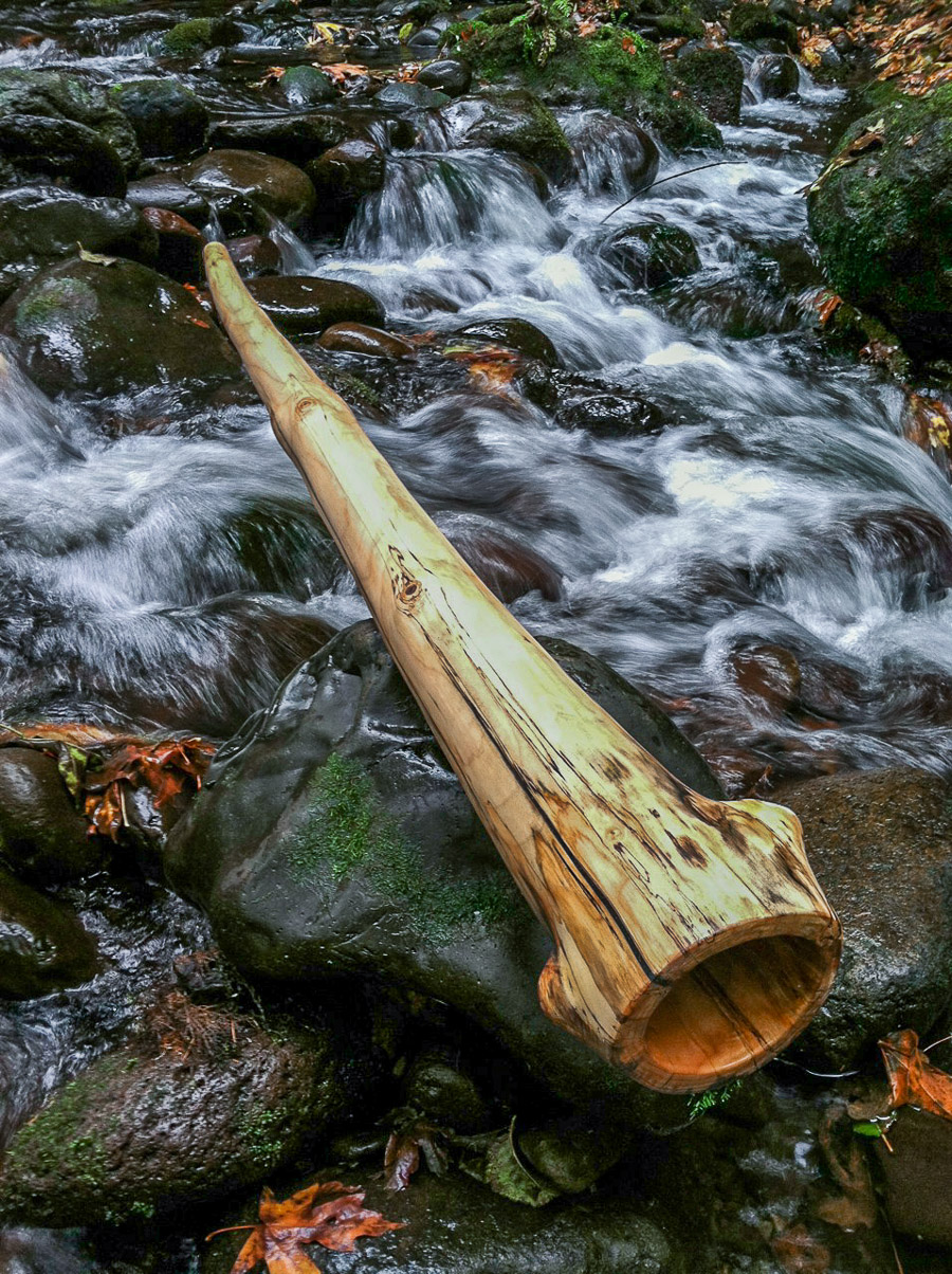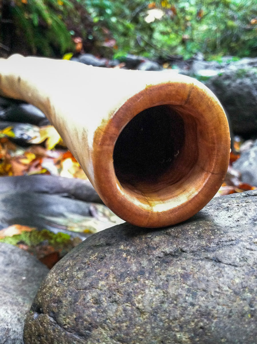 Oh yes, how I love thee. So comfortable. So inviting to exploration. I find myself getting very soft and quiet examining each input of sound. Such a nice combination of attributes. Pressures up into trumpets with such gentle ease and exhibits harmonic richness. Very appropriate for heart felt sonic union. The straight cannon delivery is also very appropriate for percussive and blunt style. This stick, as a person, is very similar to Tyler Spencer, as a person. It freakin' rocks and it does so with so much maturity and so much heart. The maturity (of the didge) relates to the gentle shape of the air column paired with a careful tuning of wall thickness at different points throughout the instrument. This somewhat aggressive shape is kept under control with the woodchoice of maple being somewhere in the middle of the density ranges that I work with. I generally use the softest woods for the most agressive shapes, and the harder woods for the smaller belled instruments. That's where the heart comes in. I only work with inspiration, never out of need or pressure. I take all the lessons of my history and apply it to every moment of creation. My instruments display my intuitive abilities, and they look much more refined.