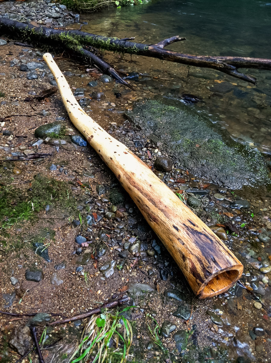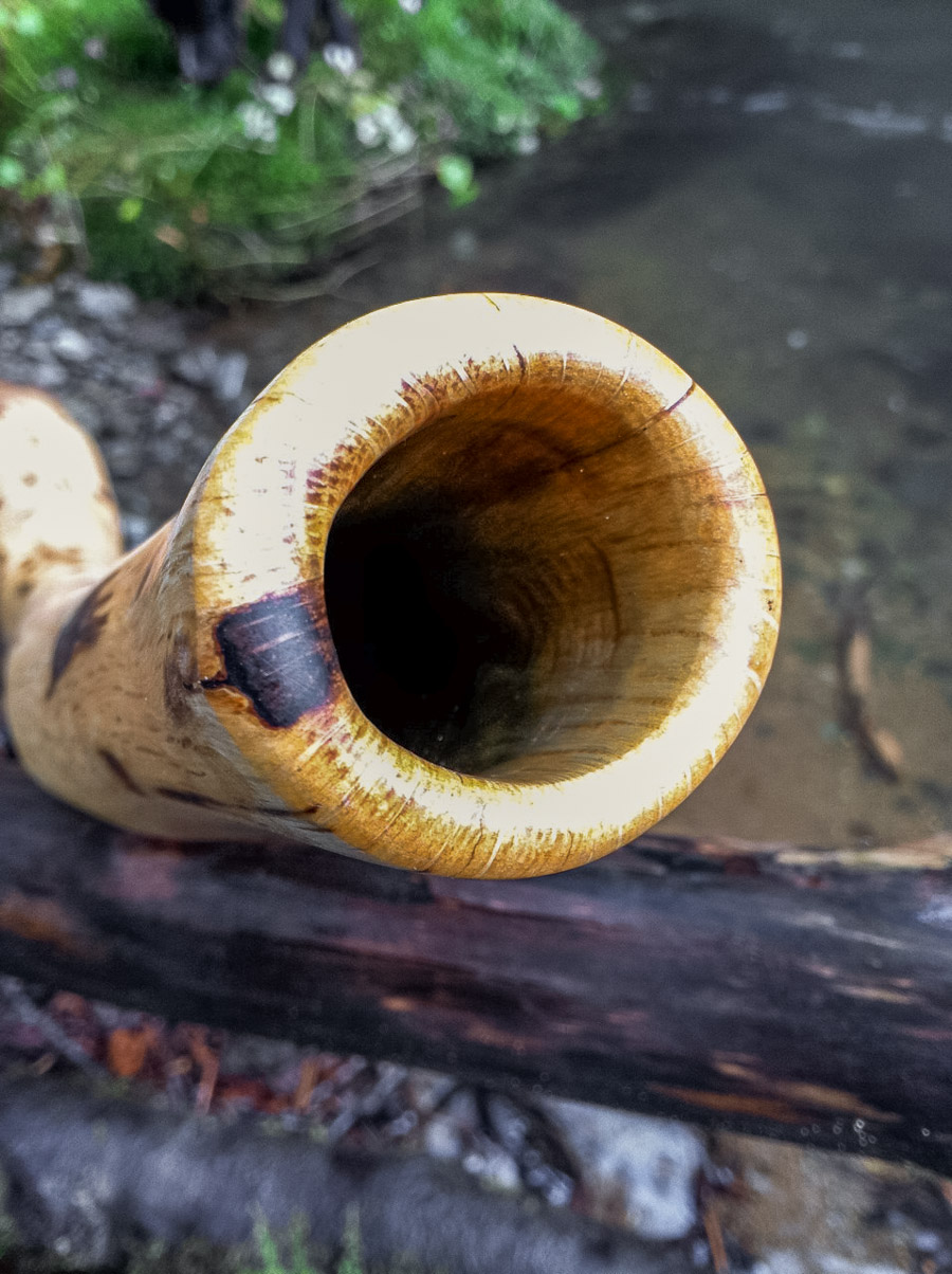 This is a big package in a reasonable size. The bore opens up at 18 inches from the mouthpiece offering plenty of it's length to be an open resonant chamber to create a big dynamic. The elongated bell makes the trumpets super easy to flow up and down through, with the volume of the trumpets being well matched to the volume of the drone. The overblowns are also appropriately well matched. No soundman be hatin' on ya. The oak is dense and thereby offers a nice deep timbre to the tone. There's a bit of gritiness to the vocals like a nice yidaki. From the very appearance the expectations are high. Once the hands touch the smooth surface and the lips contact the buttery smooth mouthpiece it all clicks into place that this is definitive of the luxery didgeridoo experience. Absolutely fantastic in every regard. Enjoys long walks on the beach. Will be your best friend, forever.