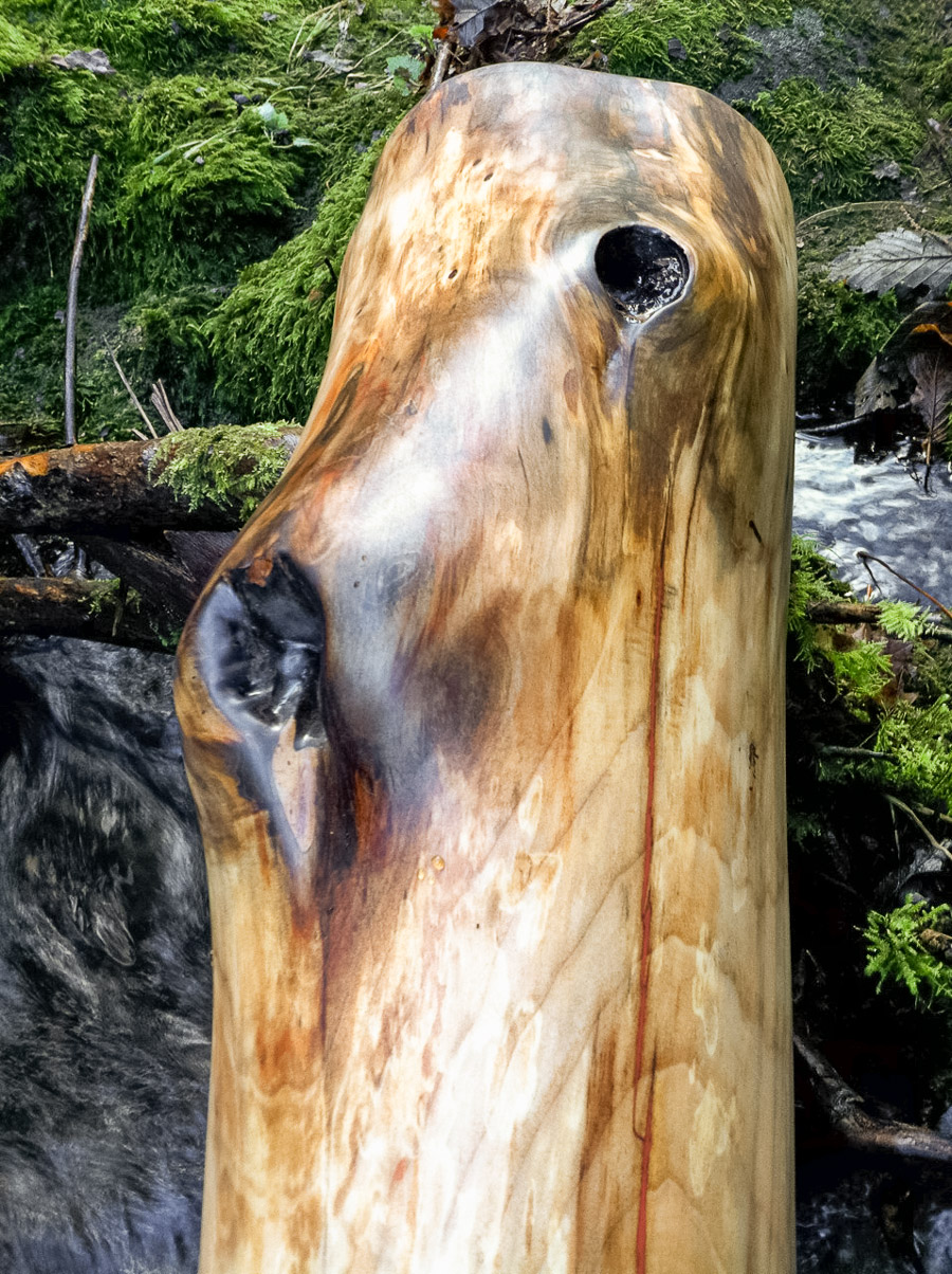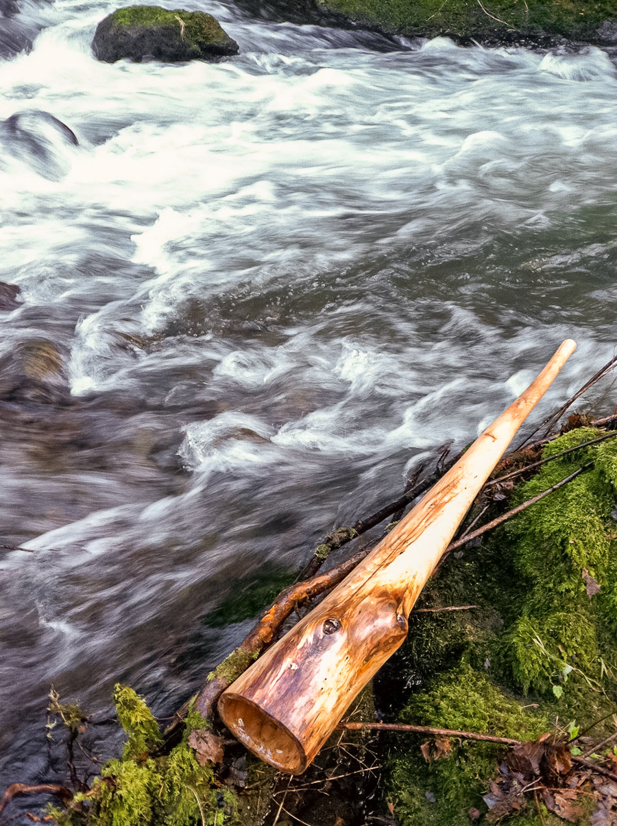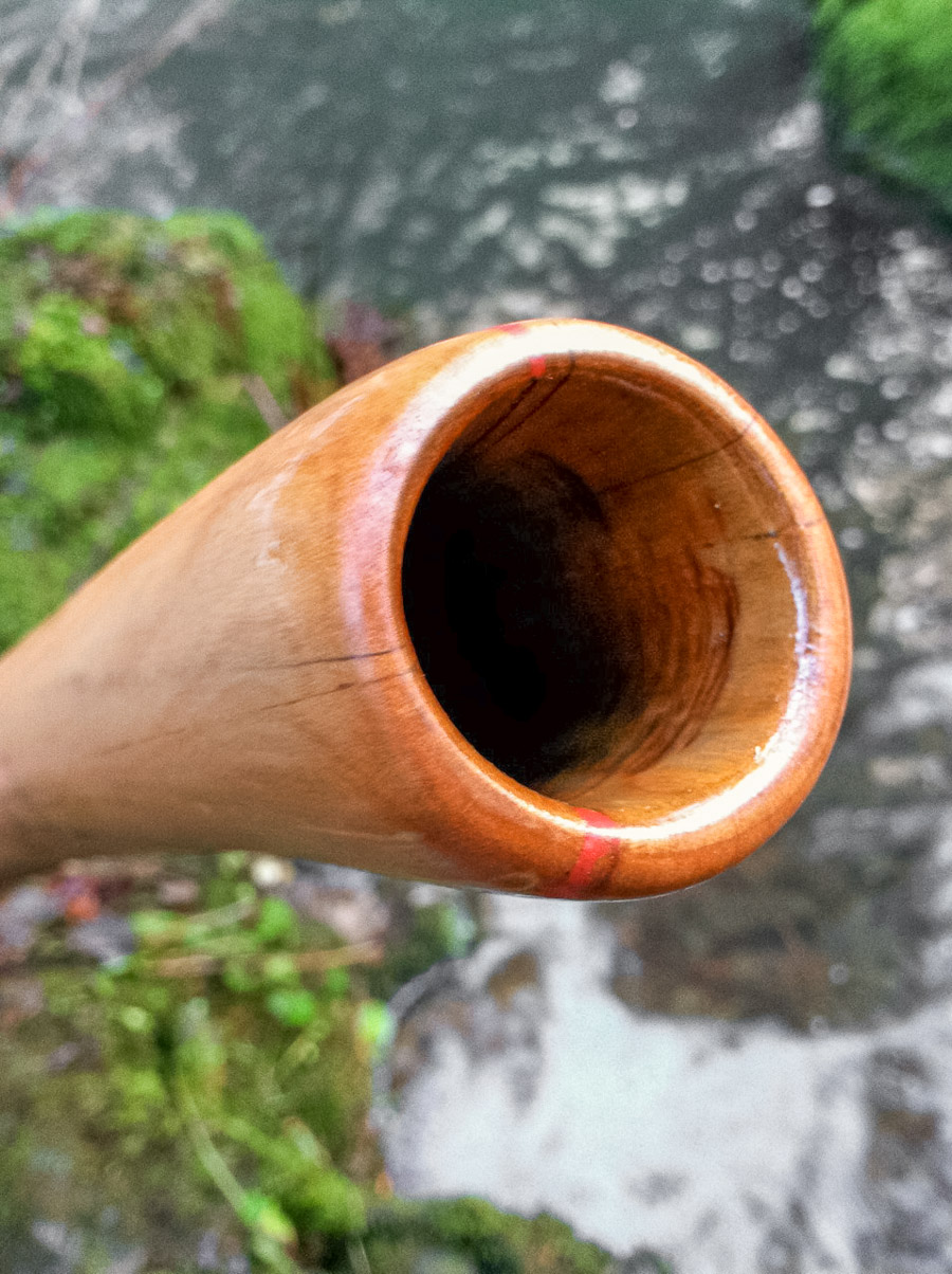 I feel so fortunate that I get to blend the lines between art and craft. With craft you use all of your knowledge and information to manufacture the superior product. Before starting, all the factors are known and the outcome is predictable. With art, the process very much becomes part of the finished product, and the artist serves similar to the capacity of a midwife, assisting in the birth of a beautiful new and truly individual creation. This didgeridoo fully embraces art, allowing me to ignore rules of balance. The result is a mind blowing view. Although the shipping will be a little more expensive for me the additional cost is really just that price a sucker's got to pay when he wants the biggest truck, the newest Ferrari, the trophy wife with the irrationally long nails and the fake-ass boobs... but this trophy wife is smart enough to keep you from looking stupid. Trouble is, if you catch a tiger by the tail, now you gotta fight a tiger. This thang is ALIVE! It takes just a bit more pressure to wake up. It's more adapted to fast playing rather than the five hour featureless drone. Who would want to do that with a didge like this anyways? Stick your lips to a firecracker and BLOW IT UP!