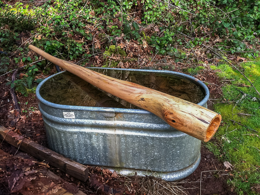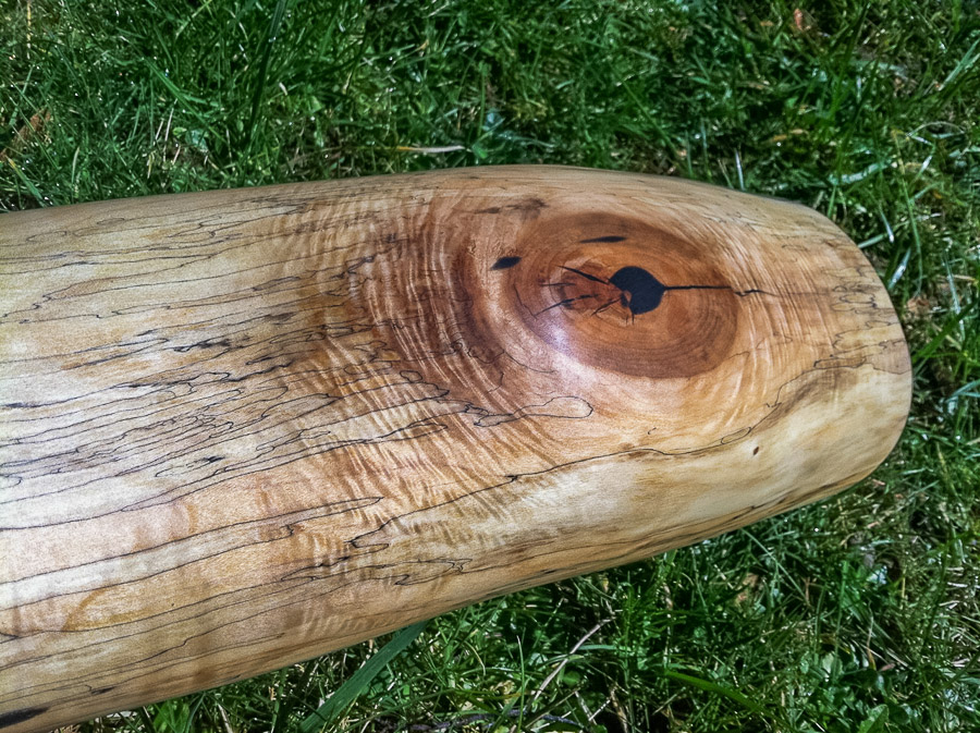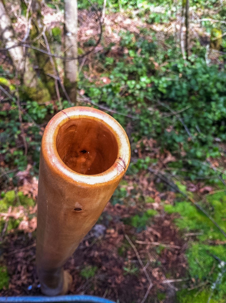Just go and read the description for #545 and paste it here. These two sticks are nearly identical in playing character. The trumpets are well matched to the drone and can be worked in so seamlessly as can the overblowns. Super well balanced sticks. The only real difference is the aesthetics of the woodtypes. For every didge I try to give a decent full length shot, some detail shot, and also a shot of the mouthpiece as it's the business end of things. Mouthpieces are extremely important to the potential. I try to show that the edges are nicely rounded offering a surface for lip contact throughout mouth shape changes during play. Sharper inside edges reduce lip contact area and therefor reduce potential. My outside diameter mouthpiece measurement is there to show that it's not some big chunky thang that'll also rest against your chin and nose while you play restricting movement and therfor, oh don't even make me say it again. Why the Hell am I lecturing about didgeridoo engineering? It took over my brain years ago and is still pulling me in. Don't send help. I'm in bliss.
