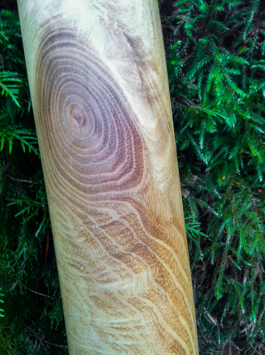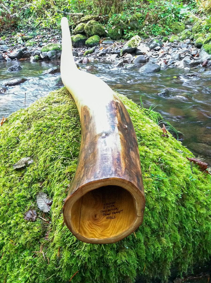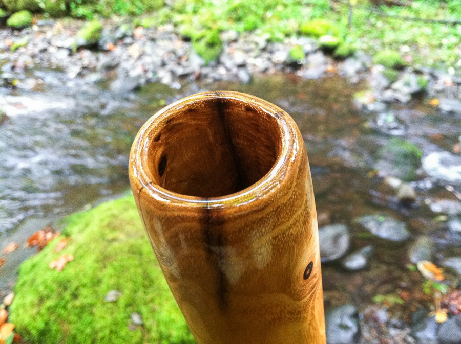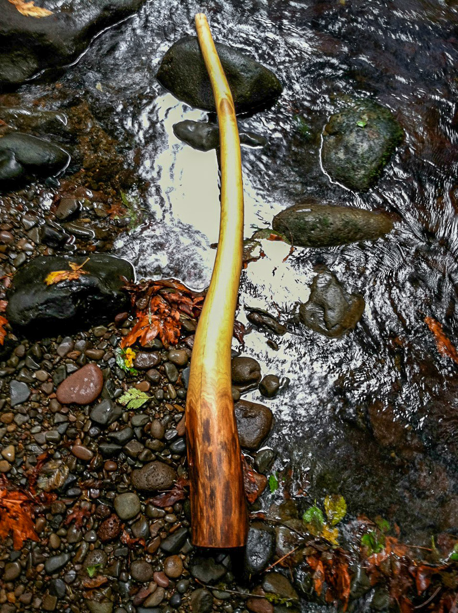 I really enjoyed making this one quite a bit. It was a collaborative effort between myself and a French Canadian didgecrafter that was here visiting- Jean Francois GeoGaia. We selected a very dense wood and shaped it long enough with enough bore volume for dynamic projection. We discussed and agreed on every step of it's construction. A little bit like how competition pushes people to reach higher heights we ascended to Heaven here with this incredible co-creation. It plays buttery smooth with it's first trumpet matching the fundamental which is usally a sign that a stick has nice balance. The dense wood provides such incredible tonal support that this could very believably be used in Hollywood as the voice of some GOD. Whatever name you're drawn to, this one can speak clearly for S/HE/M.