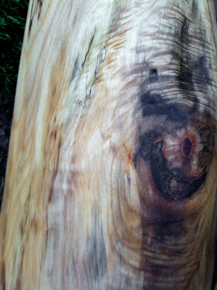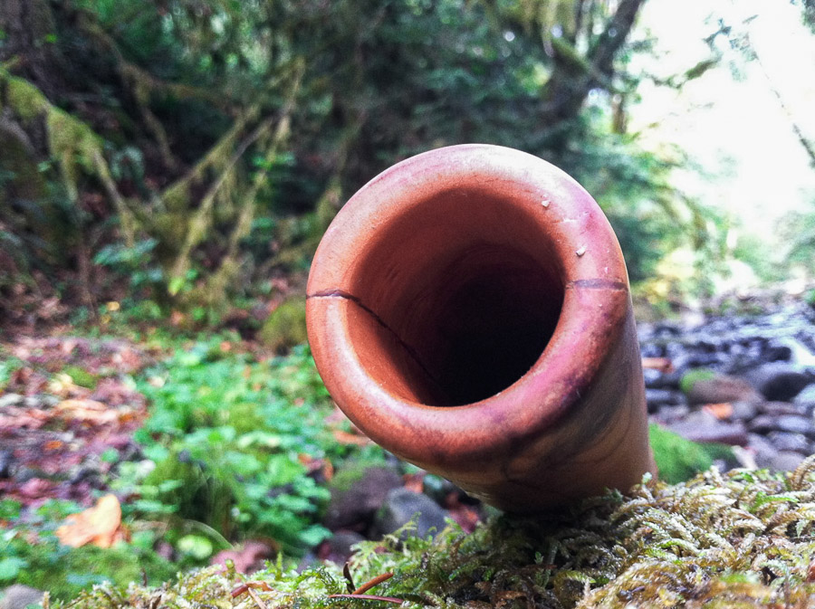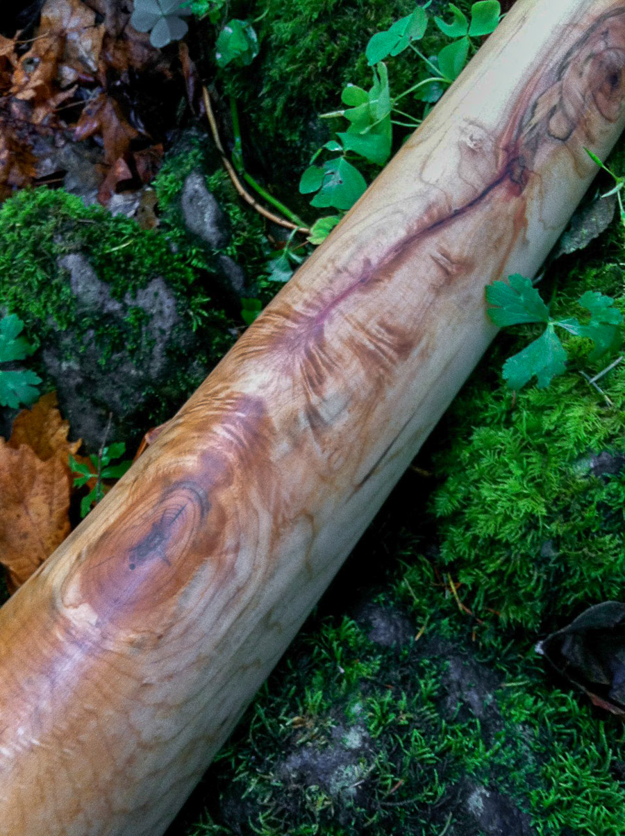 The tuning on this didge rides between Eb and D depending on your embouchure. Usually unless I mention that a tuning is wonky you can assume that it's pretty stable within ten cents of perfect. Sometimes it's easy enough to tune sticks higher or lower to pin them to some agreed upon scale but I prefer to accept the results having already balanced it in my mind in the shaping process. This didge is pure comfort to play. An effortless drone that pulls the sound from your lips. It's got a giant sound. A nice giant, like Godzilla as a girl child, right? And plenty of heft to give it a nice deep timbre because a big tough stick like this can't have no Mike Tyson voice. It packs a punch yet stays refined. Now get out there and bite some ears off!