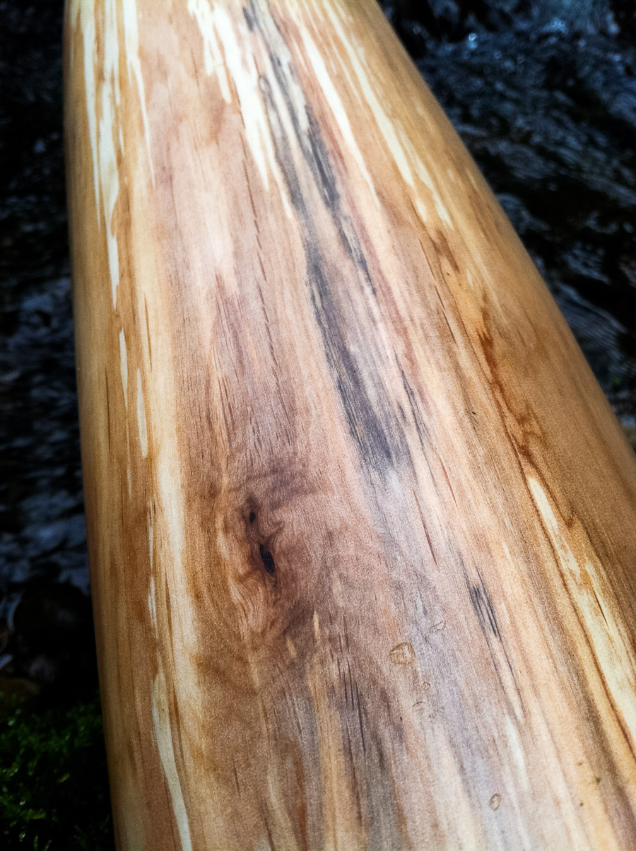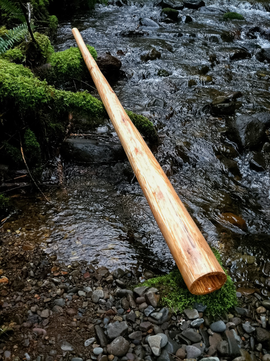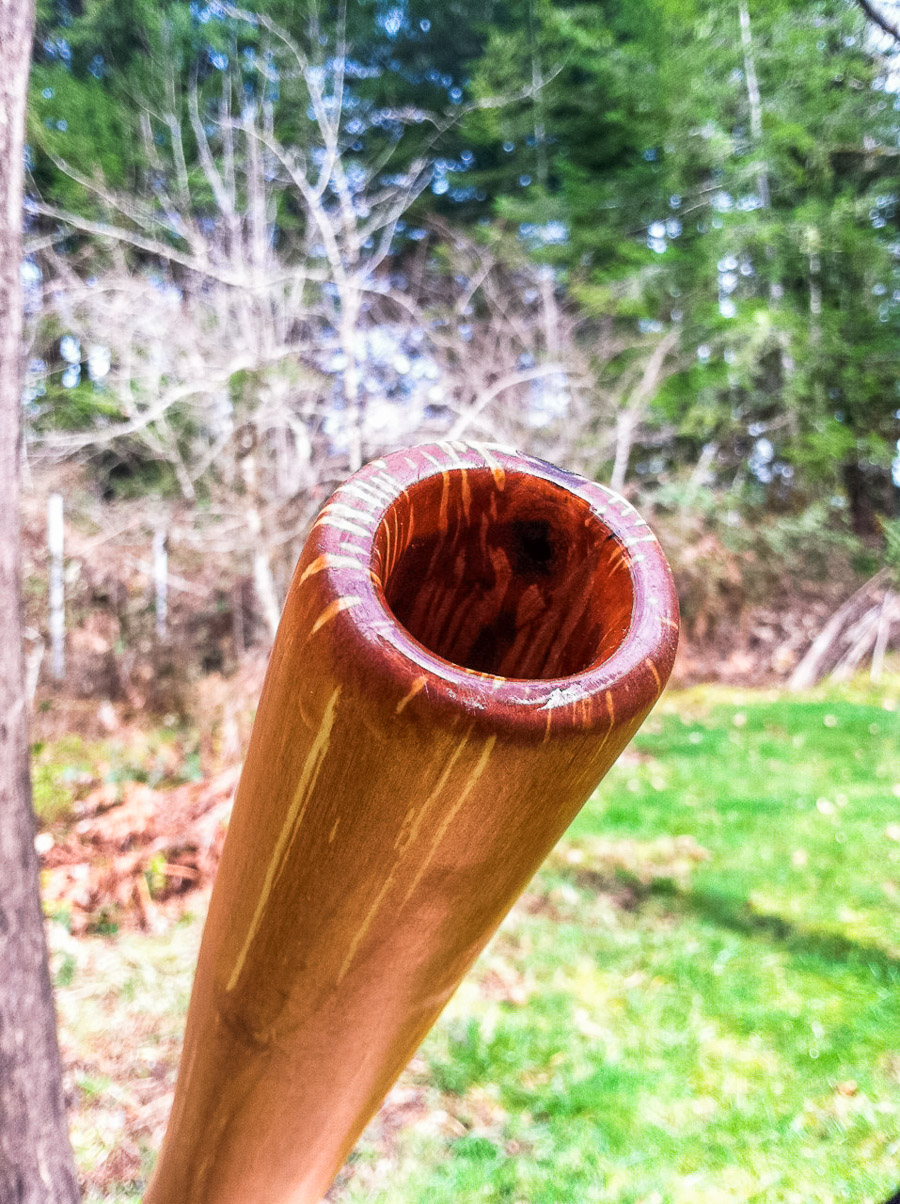 This is a fantastic B didgeridoo. Often B's can just be slow and boring but this slender looking beast actually has a fairly open top end feeding into such a gradual taper that it maintains an excellent balance and ideal amount of back pressure. The alder timber has a warmth that offsets what could otherwise become too harsh of a tone by the interior coating, though this shape is worthy of copying if there's any aspiring didge crafters out there who are using very dense woods. If it's dense, keep the bell smallish and the taper gradual. Softer woods are better choices for more aggressive shapes. It all comes down to the sound of the voice...!