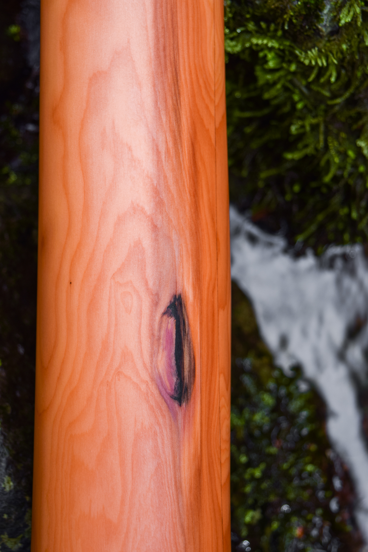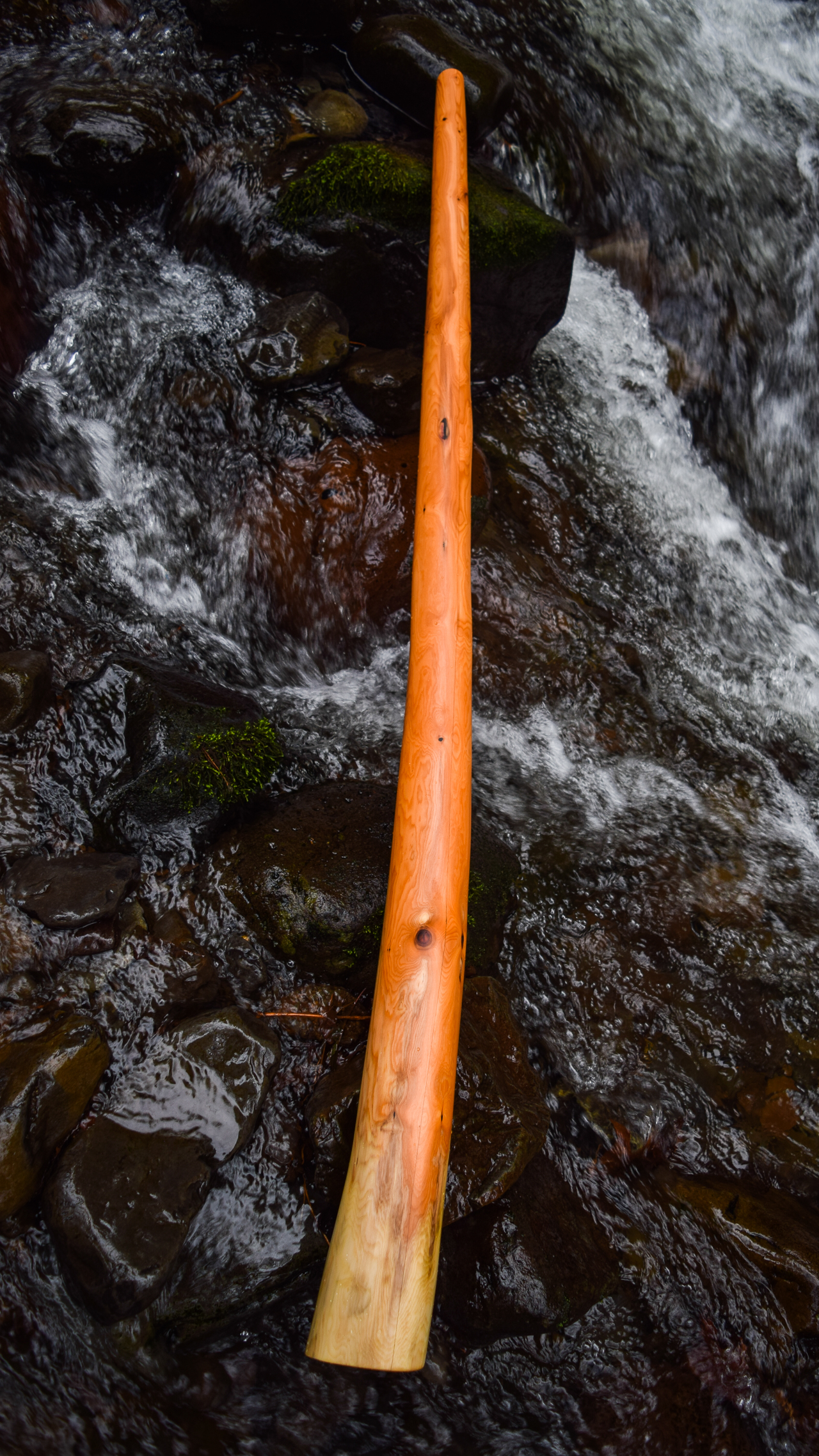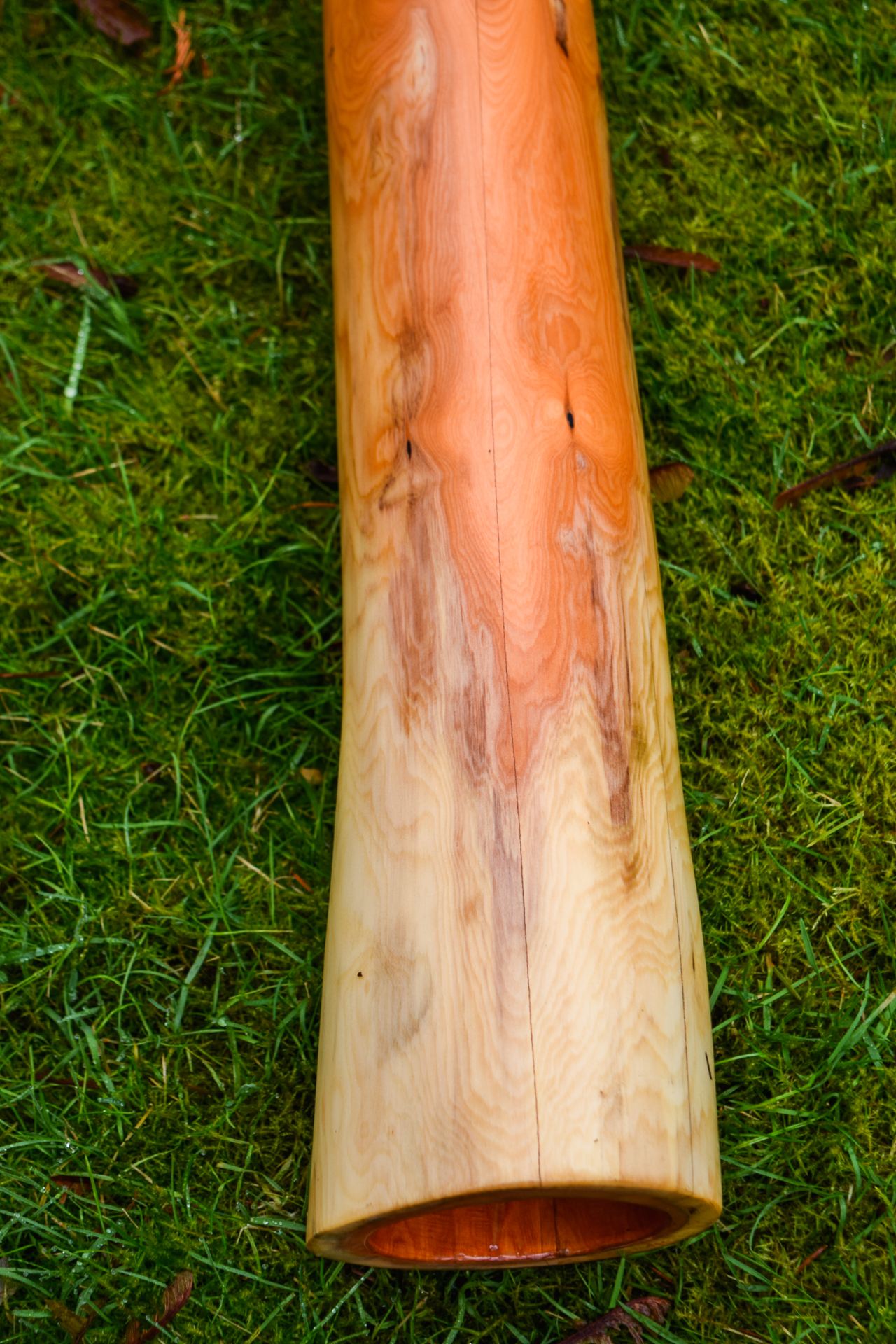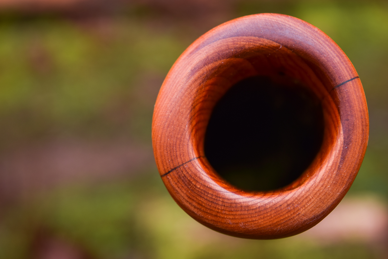 An interesting phenomena about both low instruments and extremely dense wood instruments is that they almost require that the player take a moment to get centered and grounded. That's a good lesson for any activity we put ourselves to. This didge being both low and dense doesn't have as much feedback through the instrument itself, it's more about hearing the sound reflected off of a wall or being played into a microphone. The dense walls of the Yew wood absorb nothing and deliver everything. I don't get to work with Yew as often as I'd like. So far every Yew I've crafted has been exceptional, and I'd really like to have better access it to it as a raw material. An incredibly nice instrument that I considered just keeping here for didge guests rather than offering for sale online, but I like to consider my site to be a treasure hunt, like Beanie Babies, Hot Wheels, or Baseball cards, where you pay the same low price for each new purchase but the capture can be worth many times what you paid for it. AUM.