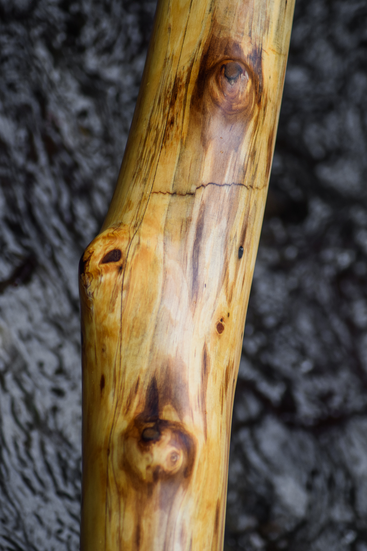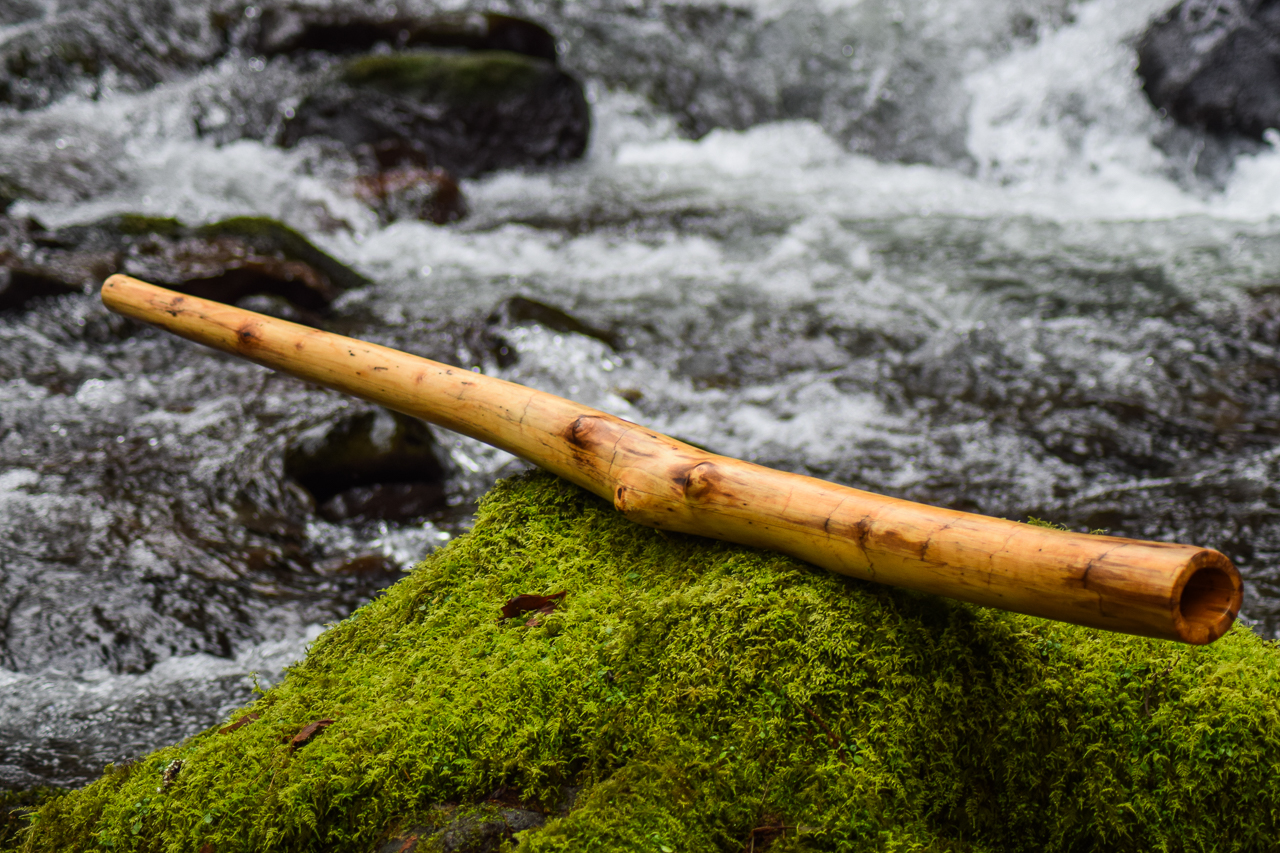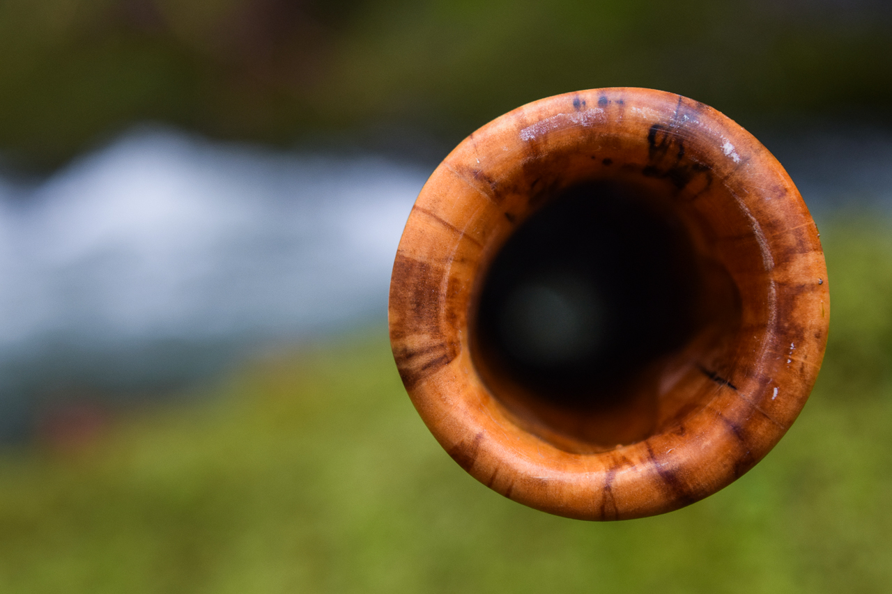 I've got a really kickass little Datsun wagon that Lewis Burns adorned with Aboriginal artwork. Being totally painted up it's appearance is a bit loud and my ex-wife always felt like it was too much of a parade. Sometimes she just wanted a regular car. I can understand that. As a didgecrafter it's easy to push the limits in every direction. The challenge sometimes is in keeping it reeled in. I built this didge with the idea in mind that this is what a didge has been like for many years until recently when things have gotten pretty extreme. The backpressure has a little resistance to it, so it's a pusher rather than a puller. Conical didges will often have a bouncy kind of backpressure, which is why didge players in yidaki regions are often referred to as 'pullers'. The push kind of didge tends to be more geared at meditative playing styles. The match of Alder's warmer tone, along with the lower key and it's playing style says this is an instrument for someone who wants to take it on nature walks. It's light enough to be a constant companion, and the smaller bell size keeps the bass from projecting through apartment walls or apartment floors. Noise is an issue for some. This instrument speaks loud and clear, but doesn't project like a drunk camper 3 spots down at 4am. If projection is what's needed, use a mic, or a louder stick. This is for reasonable folks, in a realistic world.